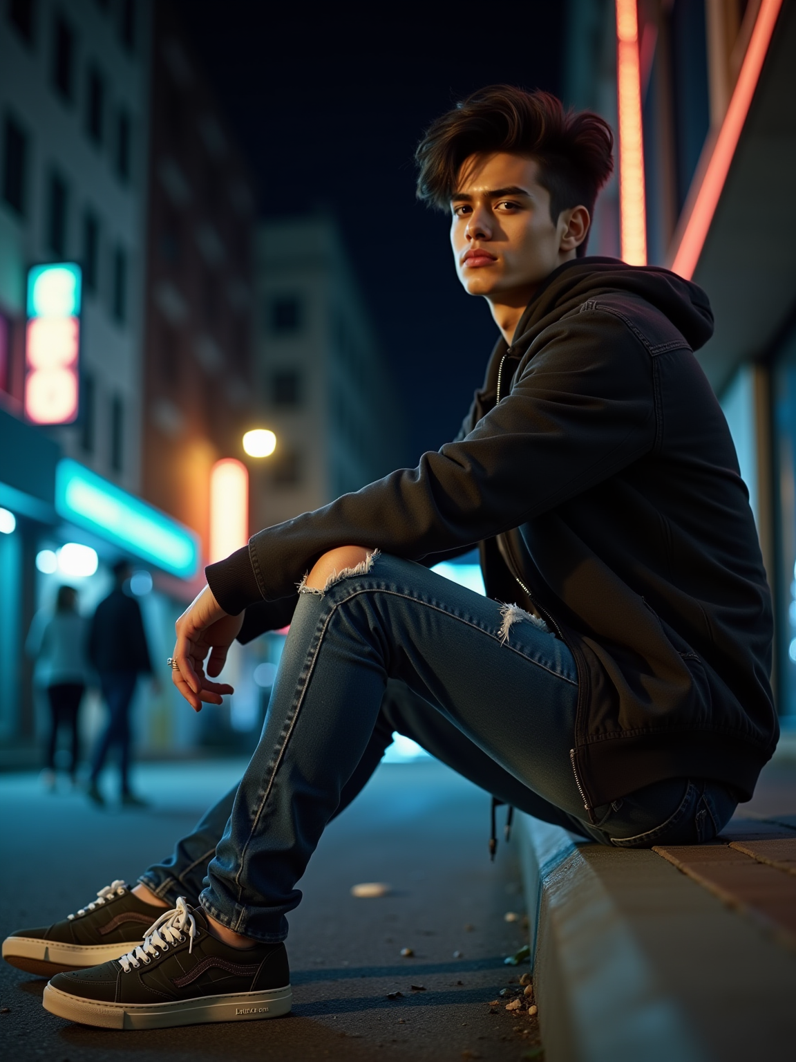 camera flash overexposed, model sitting on the curb outside a party. Wearing ripped jeans, sneakers, looking contemplative. Night street, harsh flash, spontaneous moment.