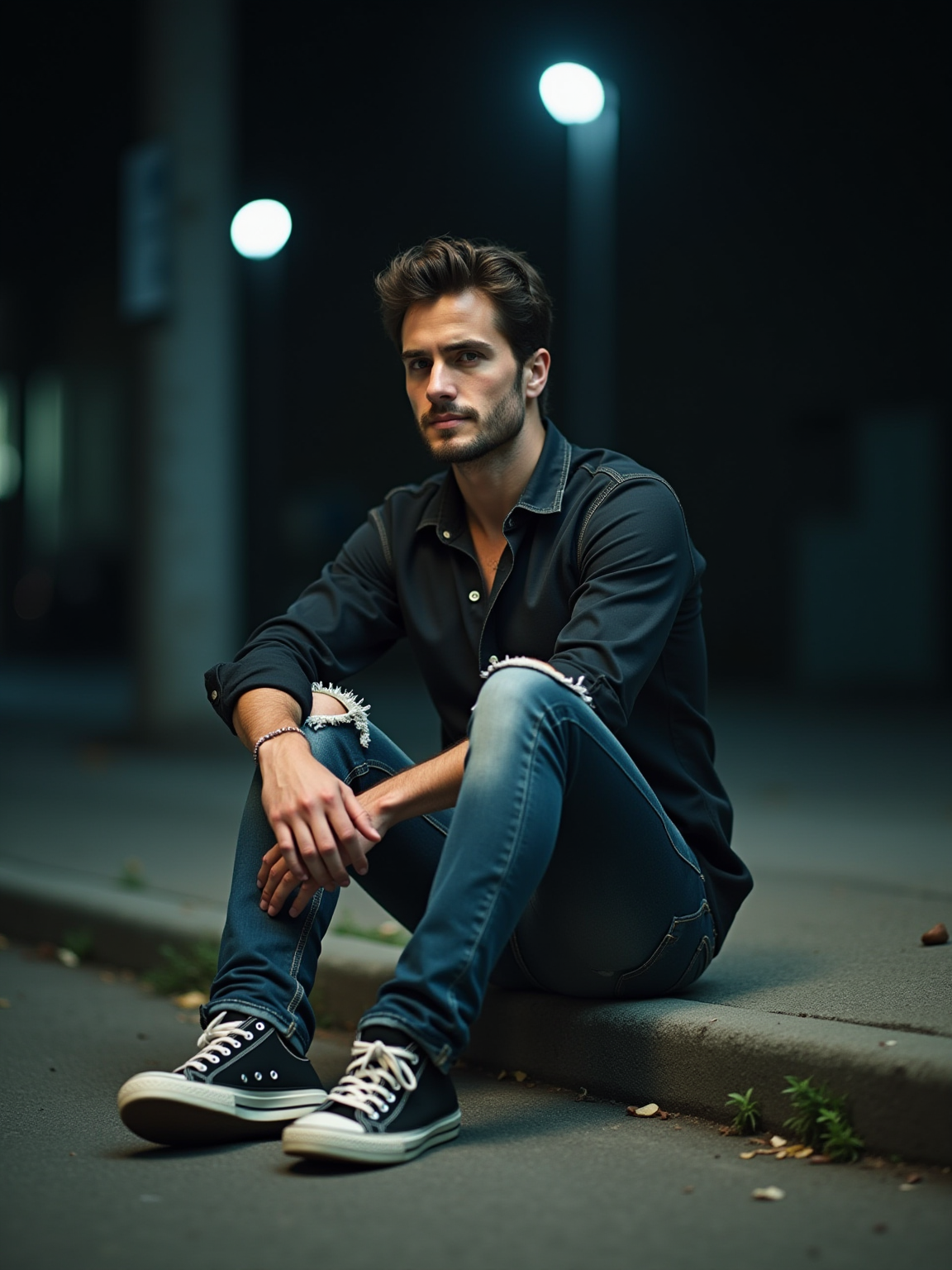 camera flash overexposed, model sitting on the curb outside a party. Wearing ripped jeans, sneakers, looking contemplative. Night street, harsh flash, spontaneous moment.