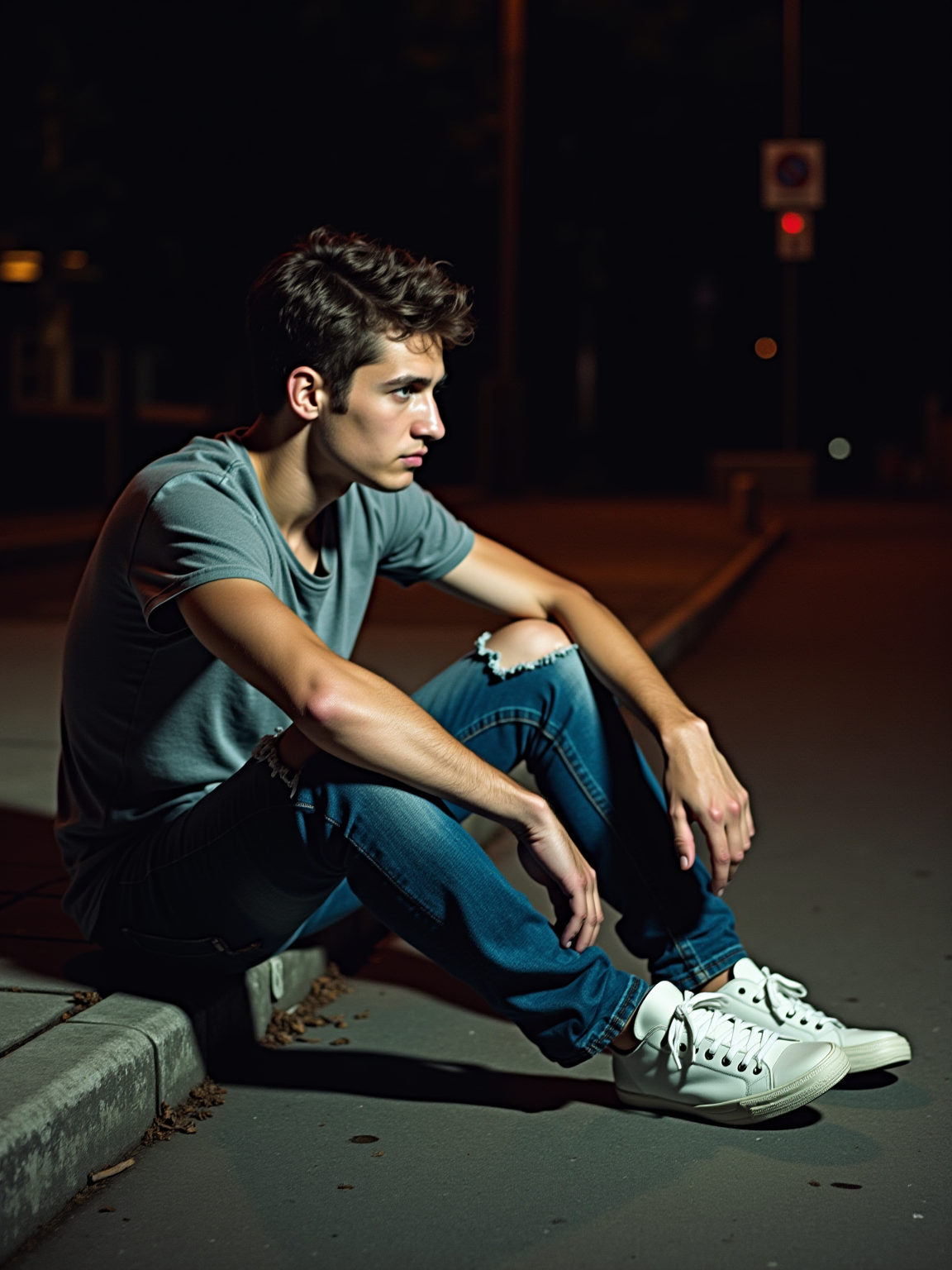 camera flash overexposed, model sitting on the curb outside a party. Wearing ripped jeans, sneakers, looking contemplative. Night street, harsh flash, spontaneous moment.