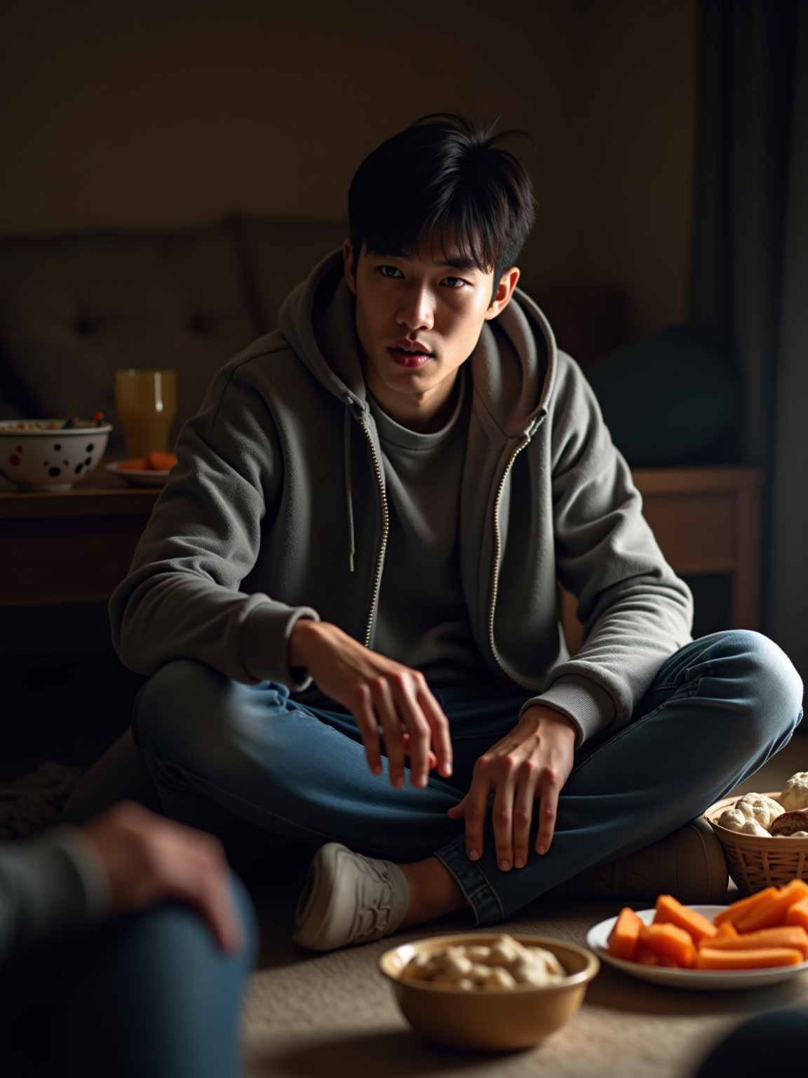 camera flash overexposed, model sitting on the floor with friends, snacks and drinks around. Wearing hoodie, telling a story. Flash, cozy, late night hangout.
