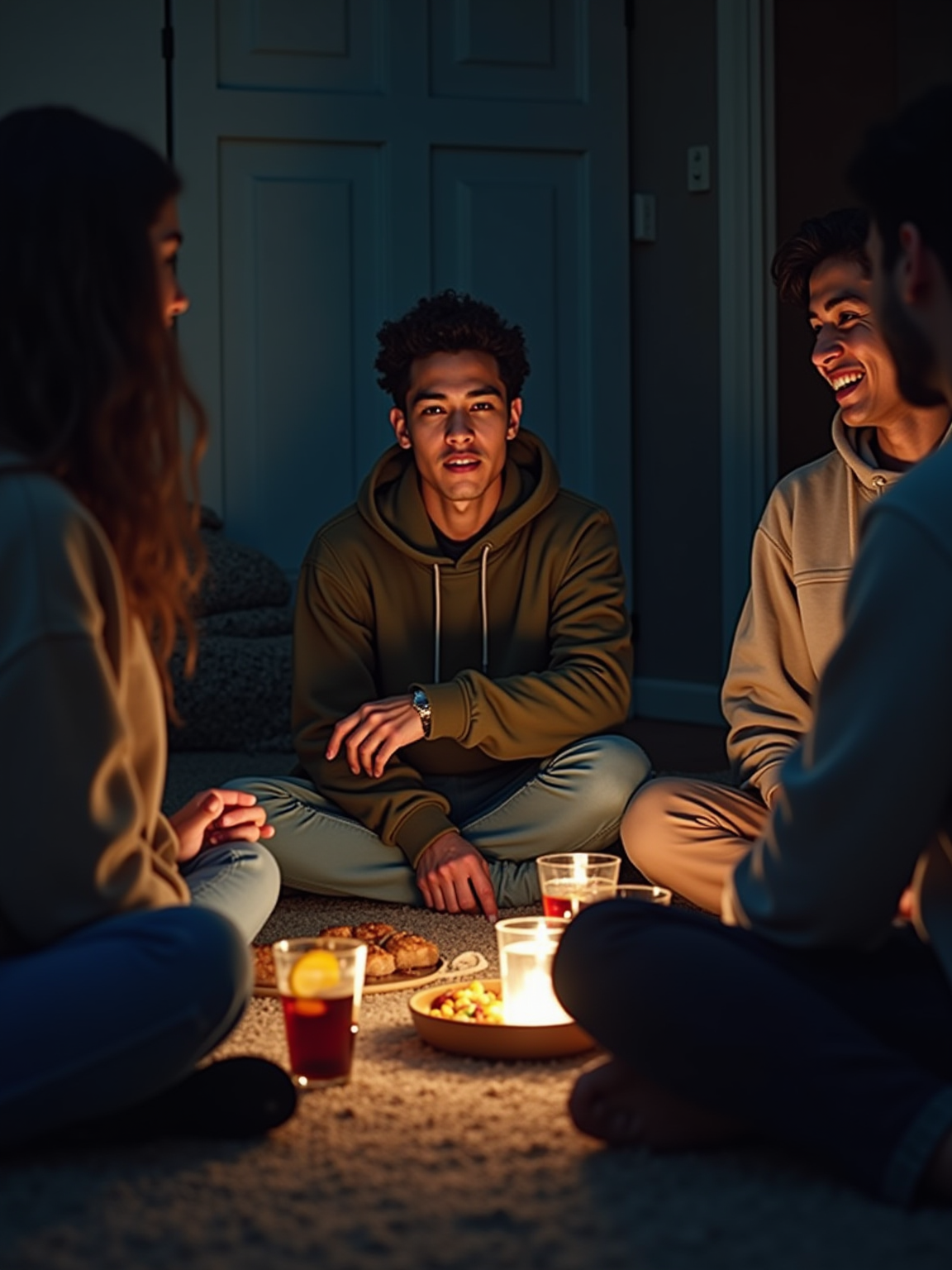 camera flash overexposed, model sitting on the floor with friends, snacks and drinks around. Wearing hoodie, telling a story. Flash, cozy, late night hangout.