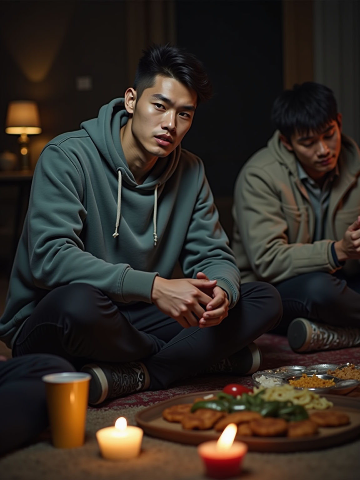 camera flash overexposed, model sitting on the floor with friends, snacks and drinks around. Wearing hoodie, telling a story. Flash, cozy, late night hangout.