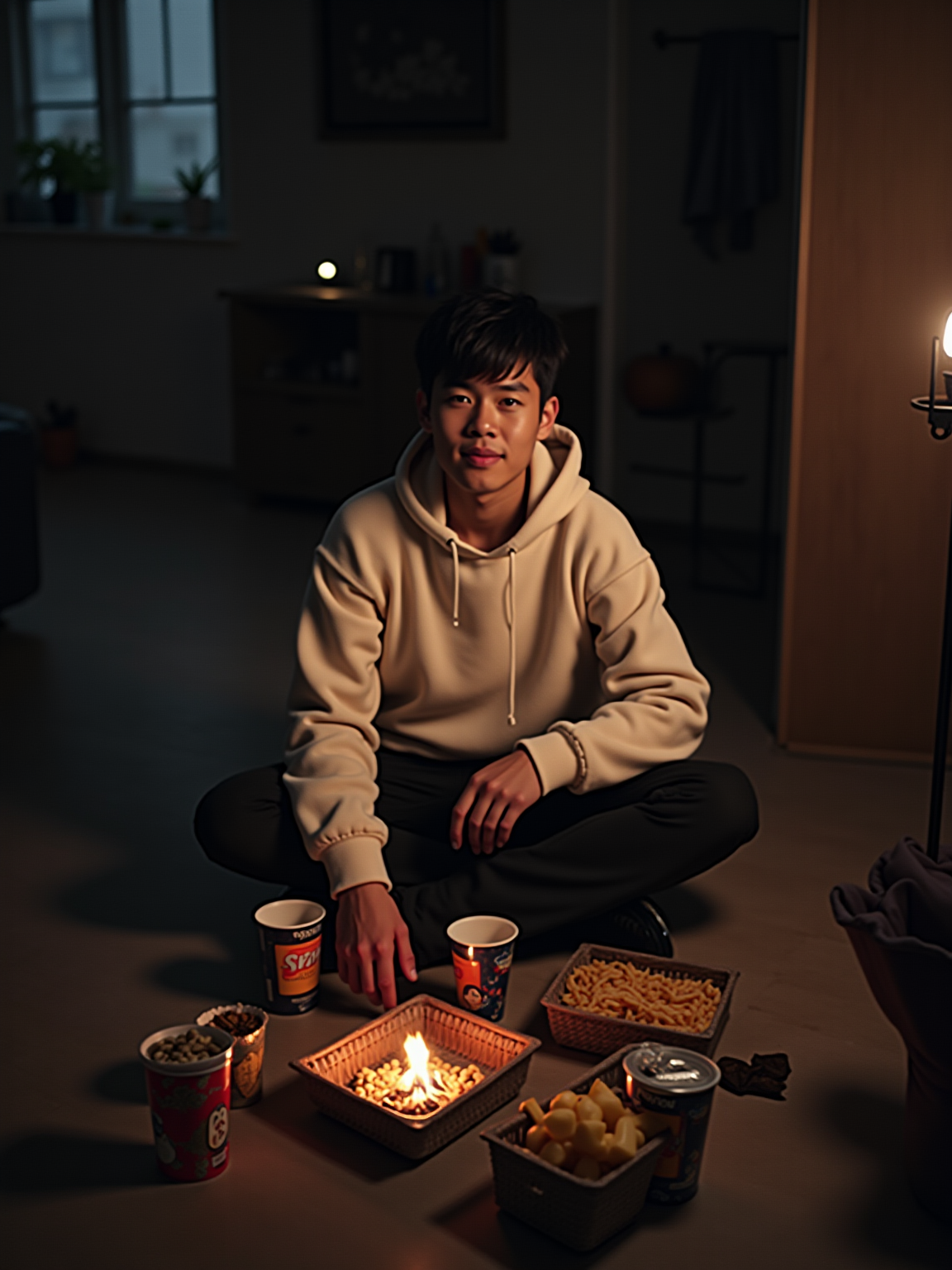 camera flash overexposed, model sitting on the floor with friends, snacks and drinks around. Wearing hoodie, telling a story. Flash, cozy, late night hangout.