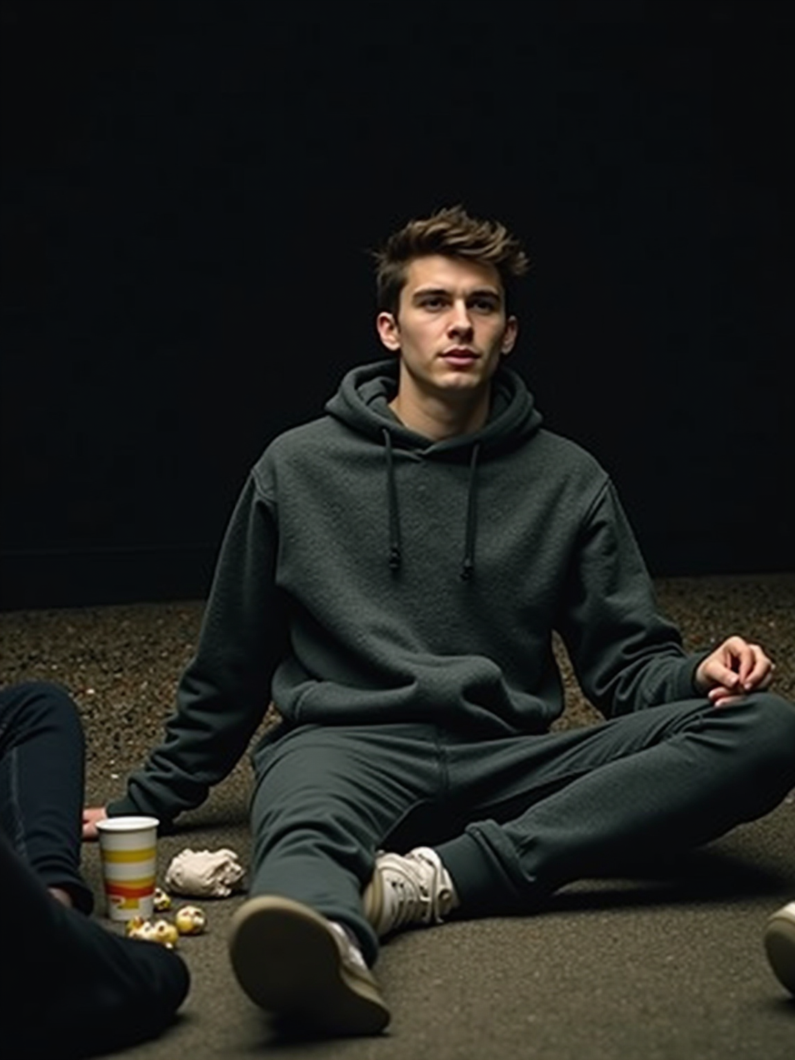 camera flash overexposed, model sitting on the floor with friends, snacks and drinks around. Wearing hoodie, telling a story. Flash, cozy, late night hangout.