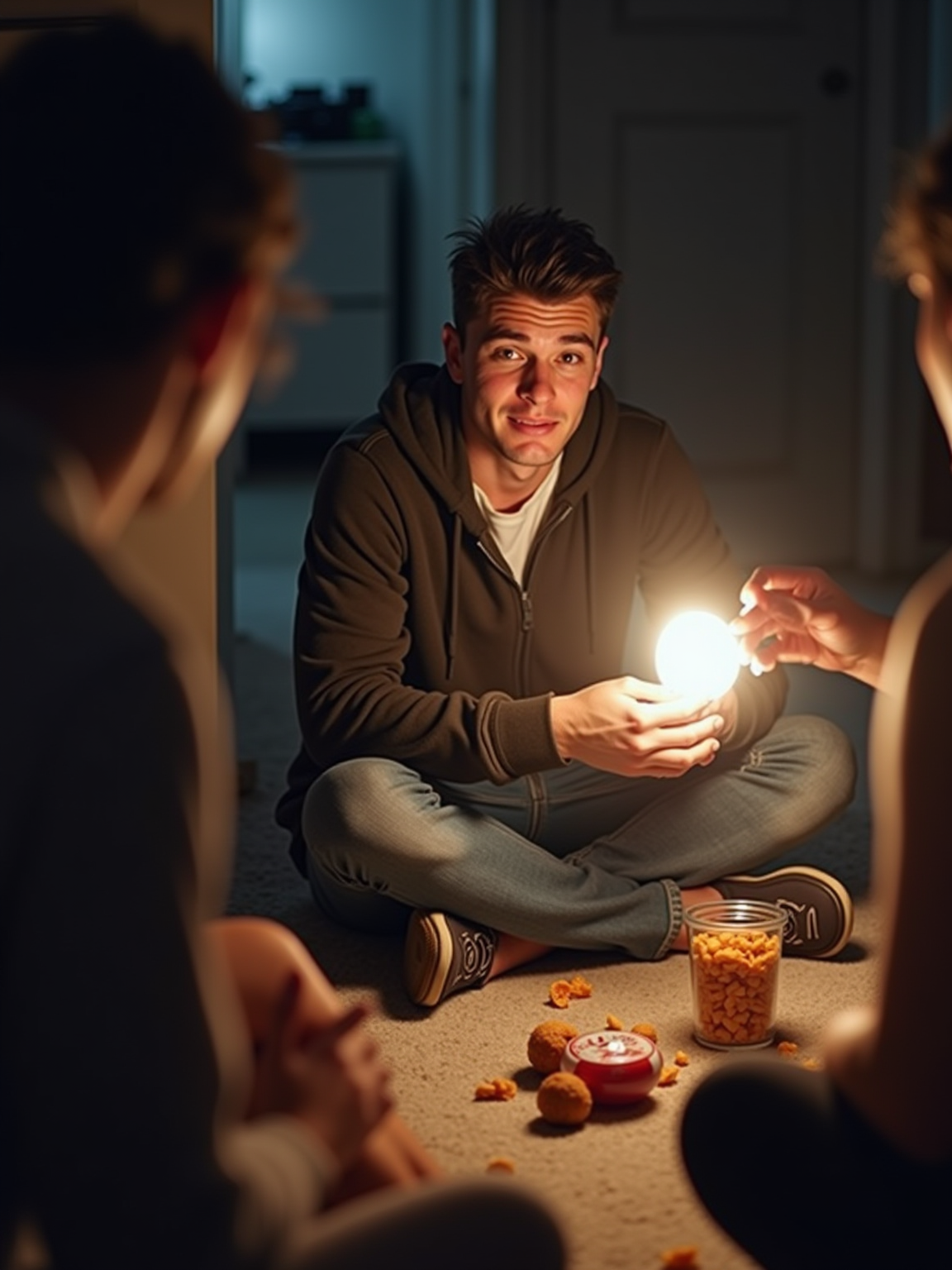 camera flash overexposed, model sitting on the floor with friends, snacks and drinks around. Wearing hoodie, telling a story. Flash, cozy, late night hangout.