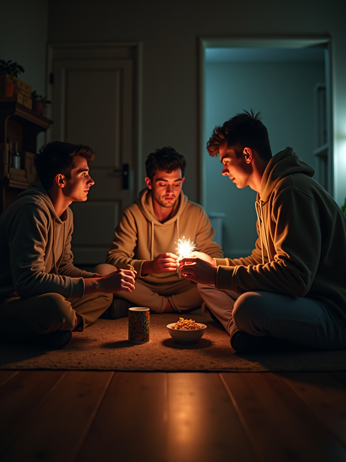 camera flash overexposed, model sitting on the floor with friends, snacks and drinks around. Wearing hoodie, telling a story. Flash, cozy, late night hangout.