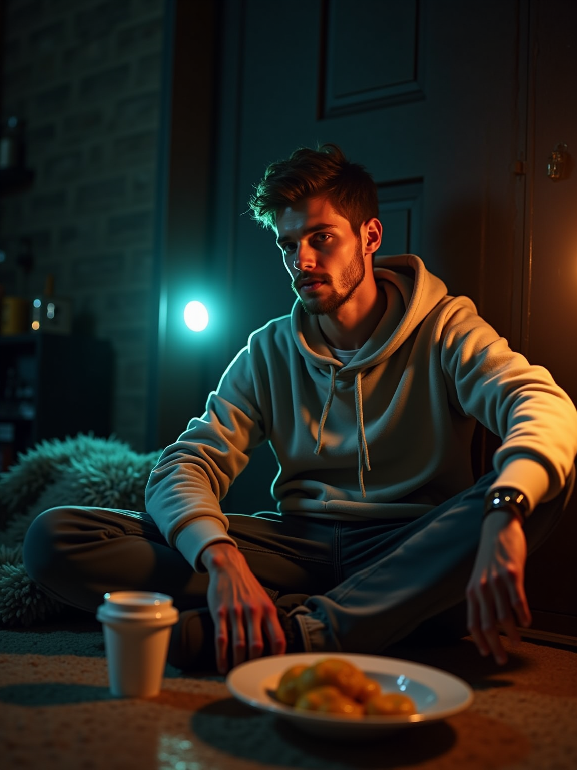 camera flash overexposed, model sitting on the floor with friends, snacks and drinks around. Wearing hoodie, telling a story. Flash, cozy, late night hangout.