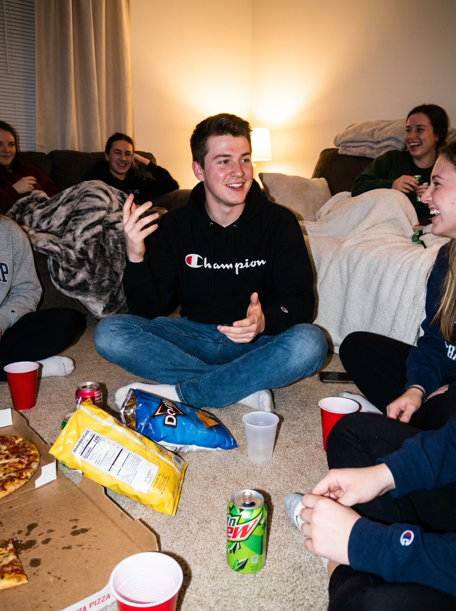 camera flash overexposed, model sitting on the floor with friends, snacks and drinks around. Wearing hoodie, telling a story. Flash, cozy, late night hangout.