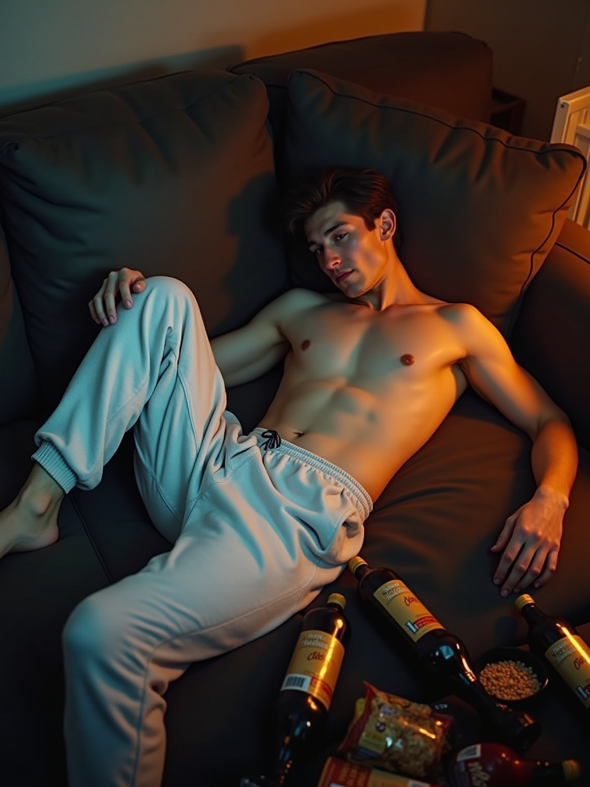 camera flash overexposed, model sprawled on a couch with snacks and empty bottles. Wearing sweatpants, holding a bag of chips. Flash-lit, messy, afterparty vibe.
