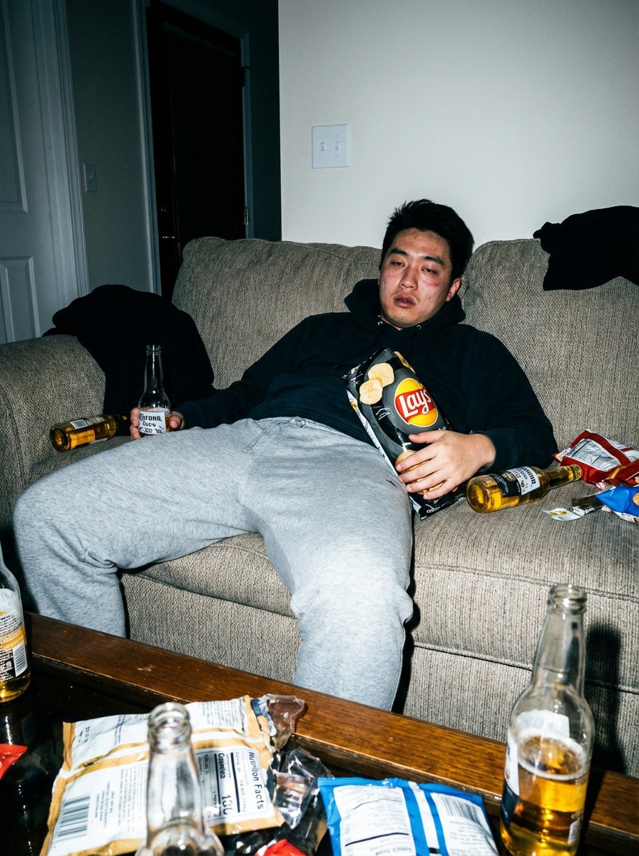 camera flash overexposed, model sprawled on a couch with snacks and empty bottles. Wearing sweatpants, holding a bag of chips. Flash-lit, messy, afterparty vibe.