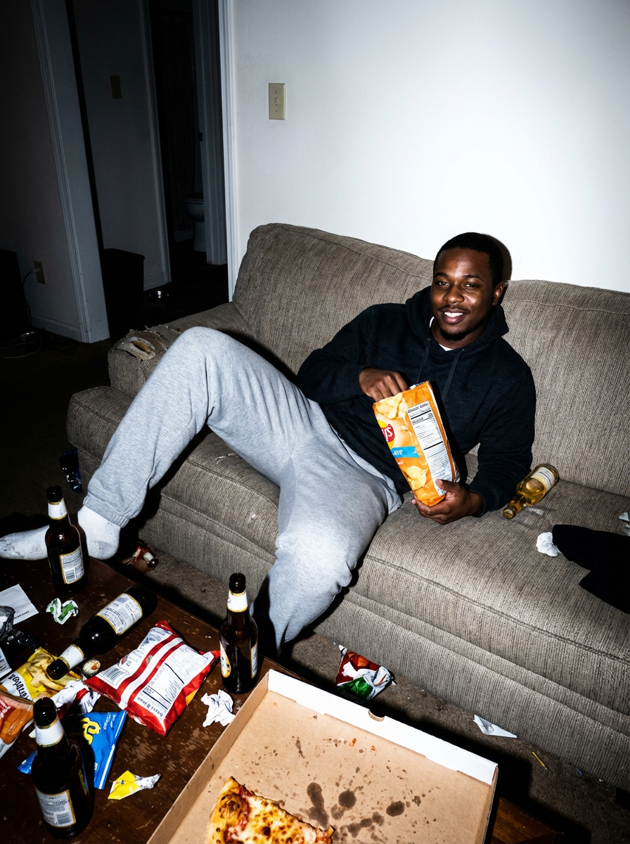 camera flash overexposed, model sprawled on a couch with snacks and empty bottles. Wearing sweatpants, holding a bag of chips. Flash-lit, messy, afterparty vibe.
