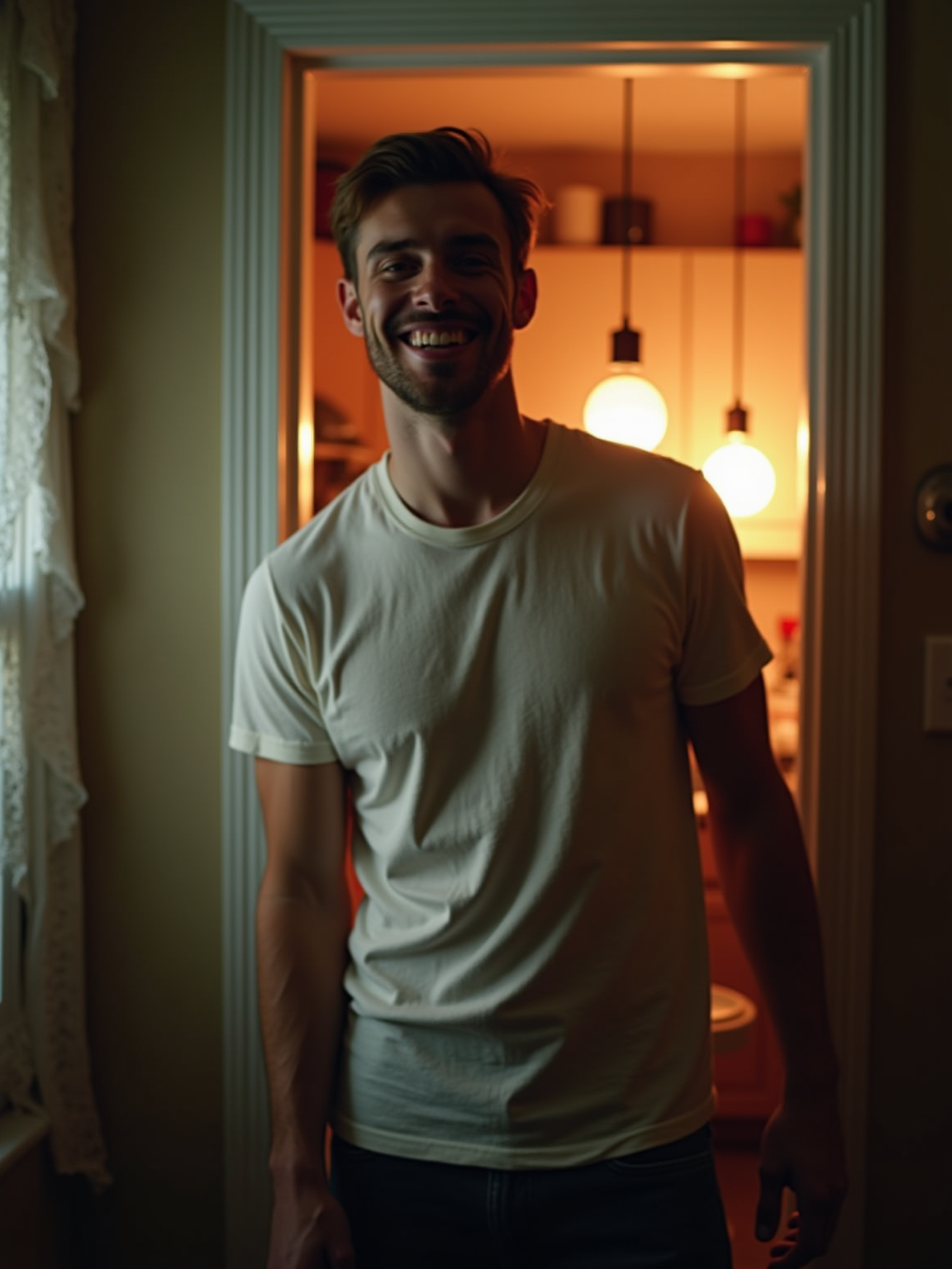 camera flash overexposed, model standing in a kitchen doorway, party in the background. Wearing t-shirt, leaning on doorframe, smiling. Flash, candid, house party energy.