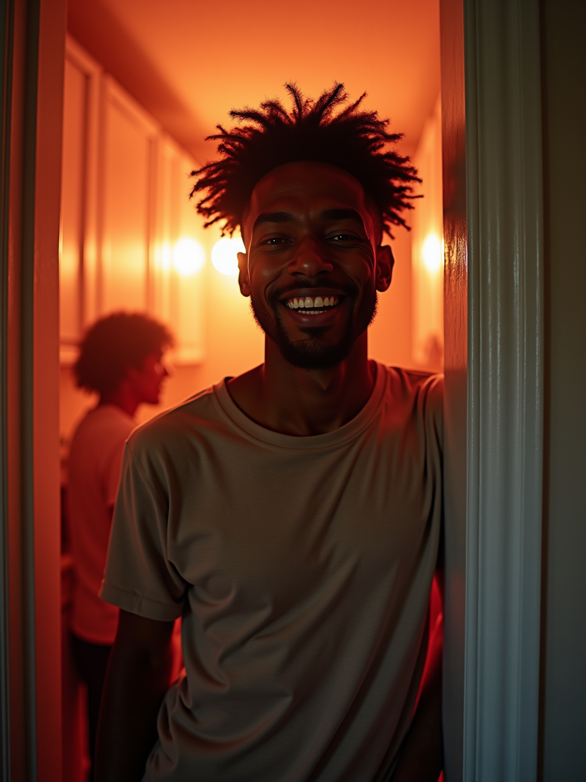 camera flash overexposed, model standing in a kitchen doorway, party in the background. Wearing t-shirt, leaning on doorframe, smiling. Flash, candid, house party energy.
