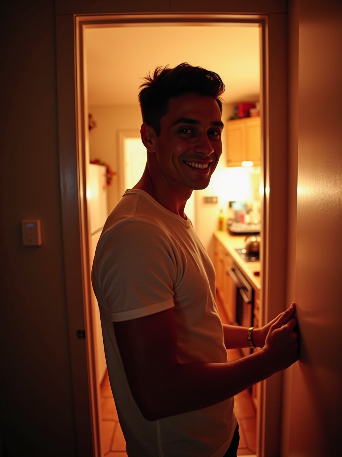 camera flash overexposed, model standing in a kitchen doorway, party in the background. Wearing t-shirt, leaning on doorframe, smiling. Flash, candid, house party energy.