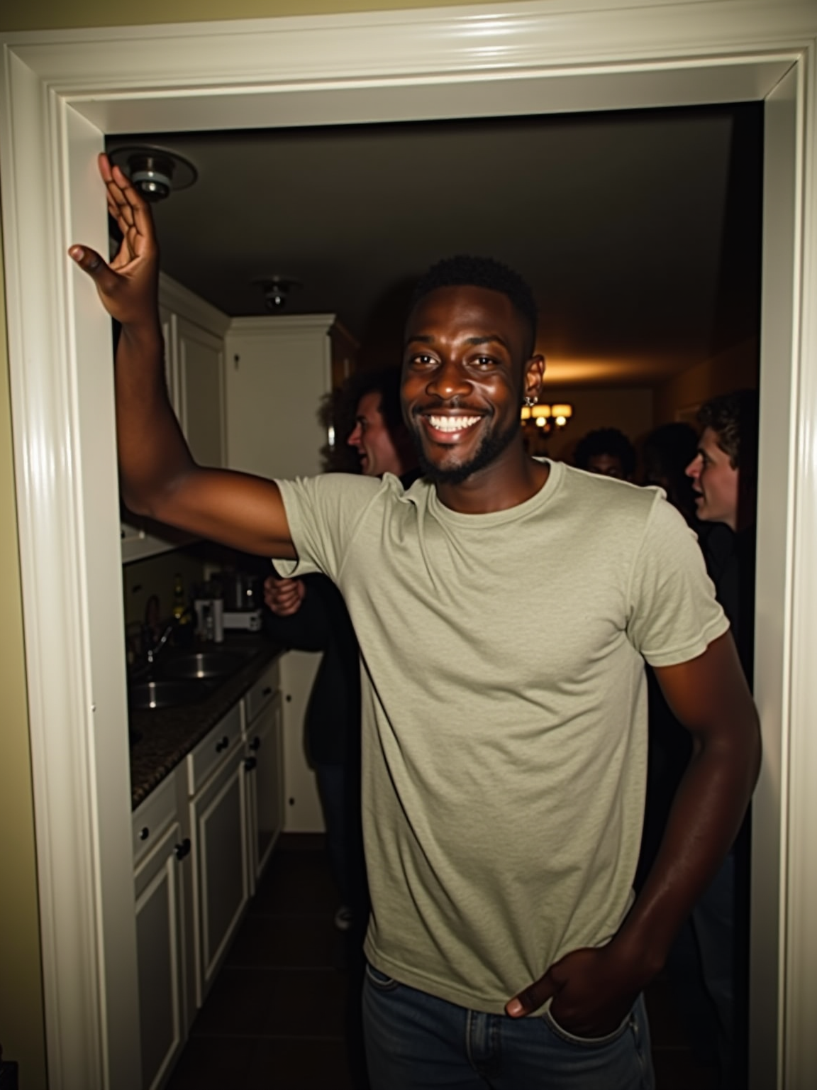 camera flash overexposed, model standing in a kitchen doorway, party in the background. Wearing t-shirt, leaning on doorframe, smiling. Flash, candid, house party energy.