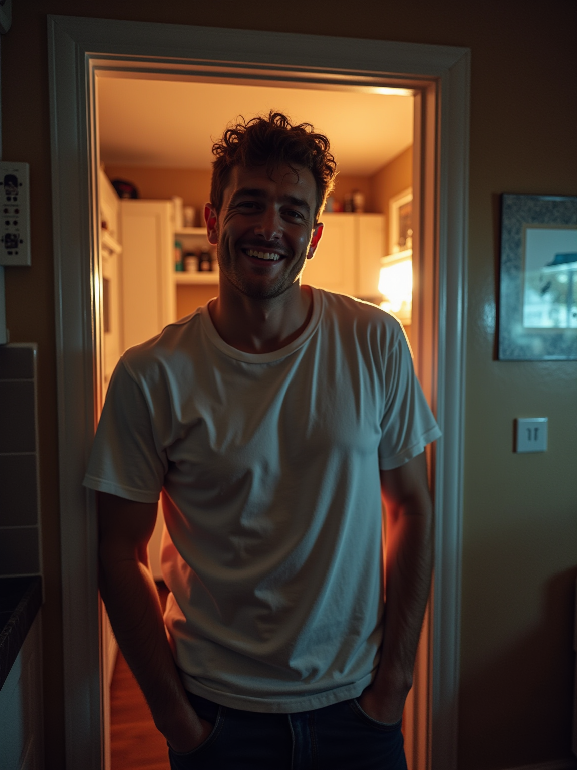 camera flash overexposed, model standing in a kitchen doorway, party in the background. Wearing t-shirt, leaning on doorframe, smiling. Flash, candid, house party energy.
