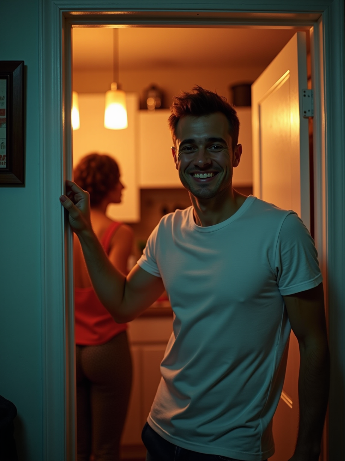 camera flash overexposed, model standing in a kitchen doorway, party in the background. Wearing t-shirt, leaning on doorframe, smiling. Flash, candid, house party energy.