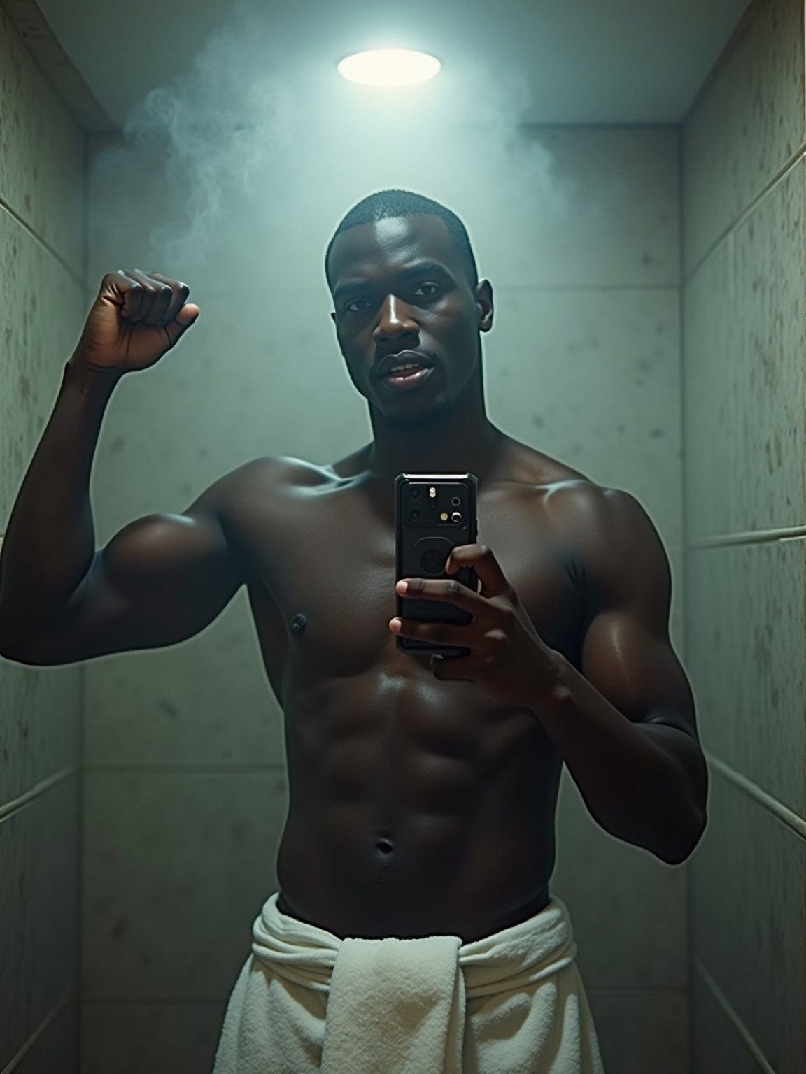 camera flash overexposed, model taking a selfie in a foggy bathroom after a shower. Wearing towel around waist, flexing. Flash reflection, steamy mirror, candid moment.
