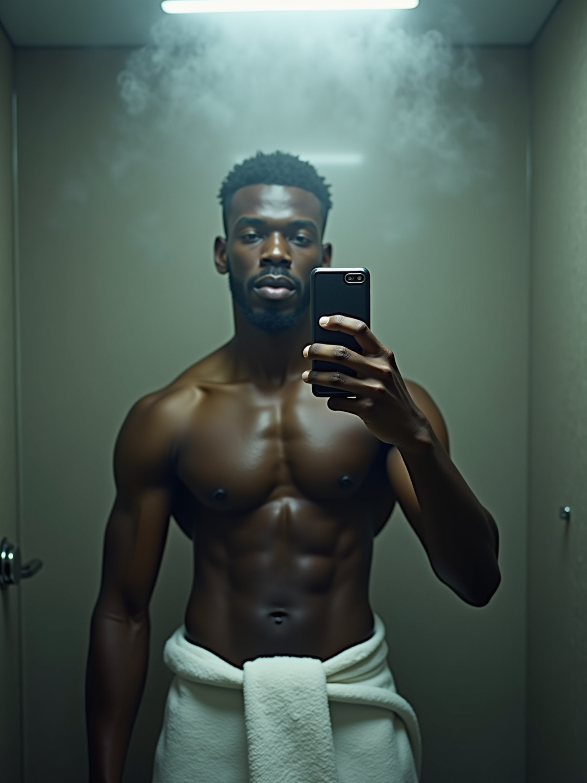 camera flash overexposed, model taking a selfie in a foggy bathroom after a shower. Wearing towel around waist, flexing. Flash reflection, steamy mirror, candid moment.