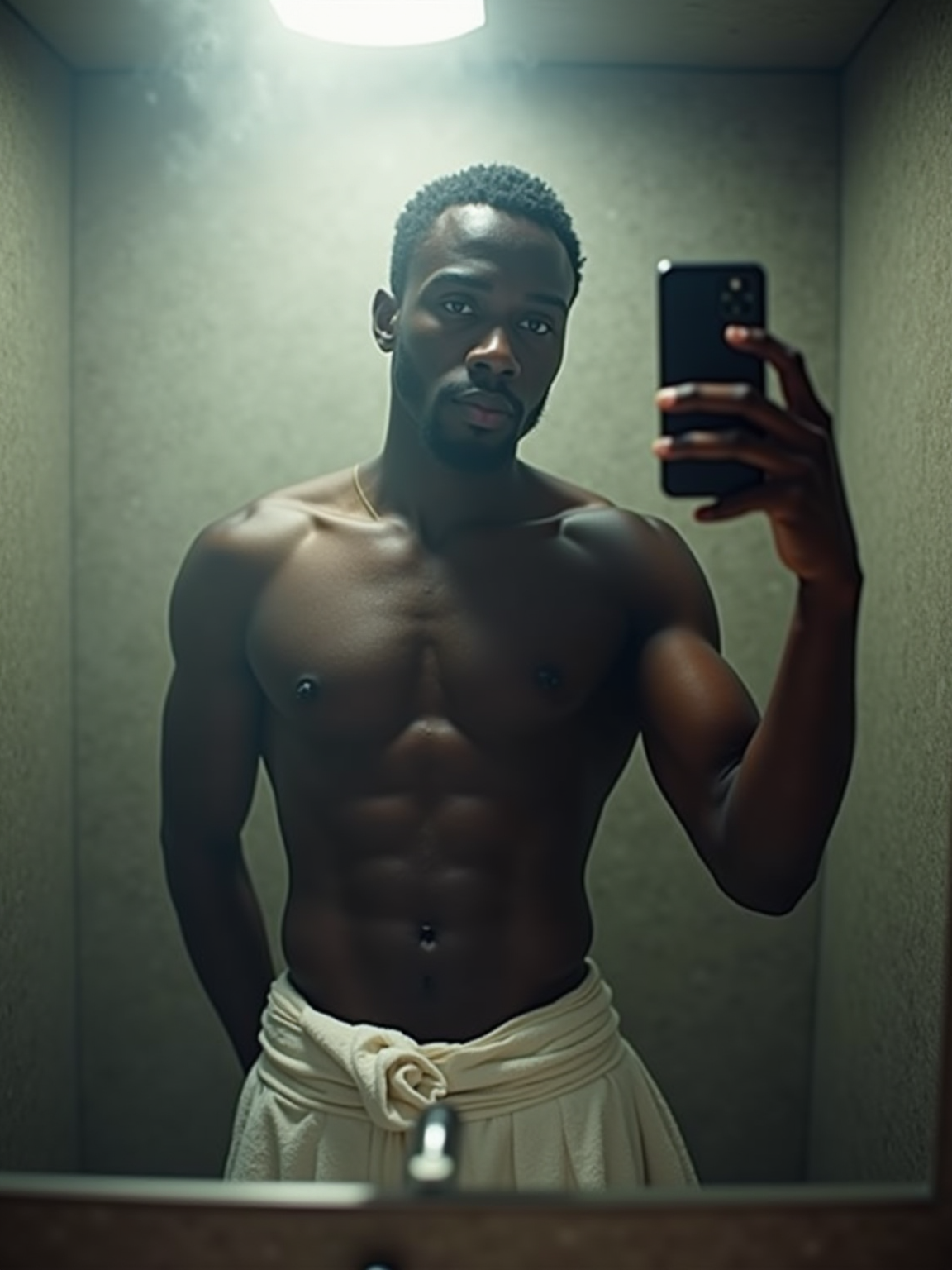 camera flash overexposed, model taking a selfie in a foggy bathroom after a shower. Wearing towel around waist, flexing. Flash reflection, steamy mirror, candid moment.