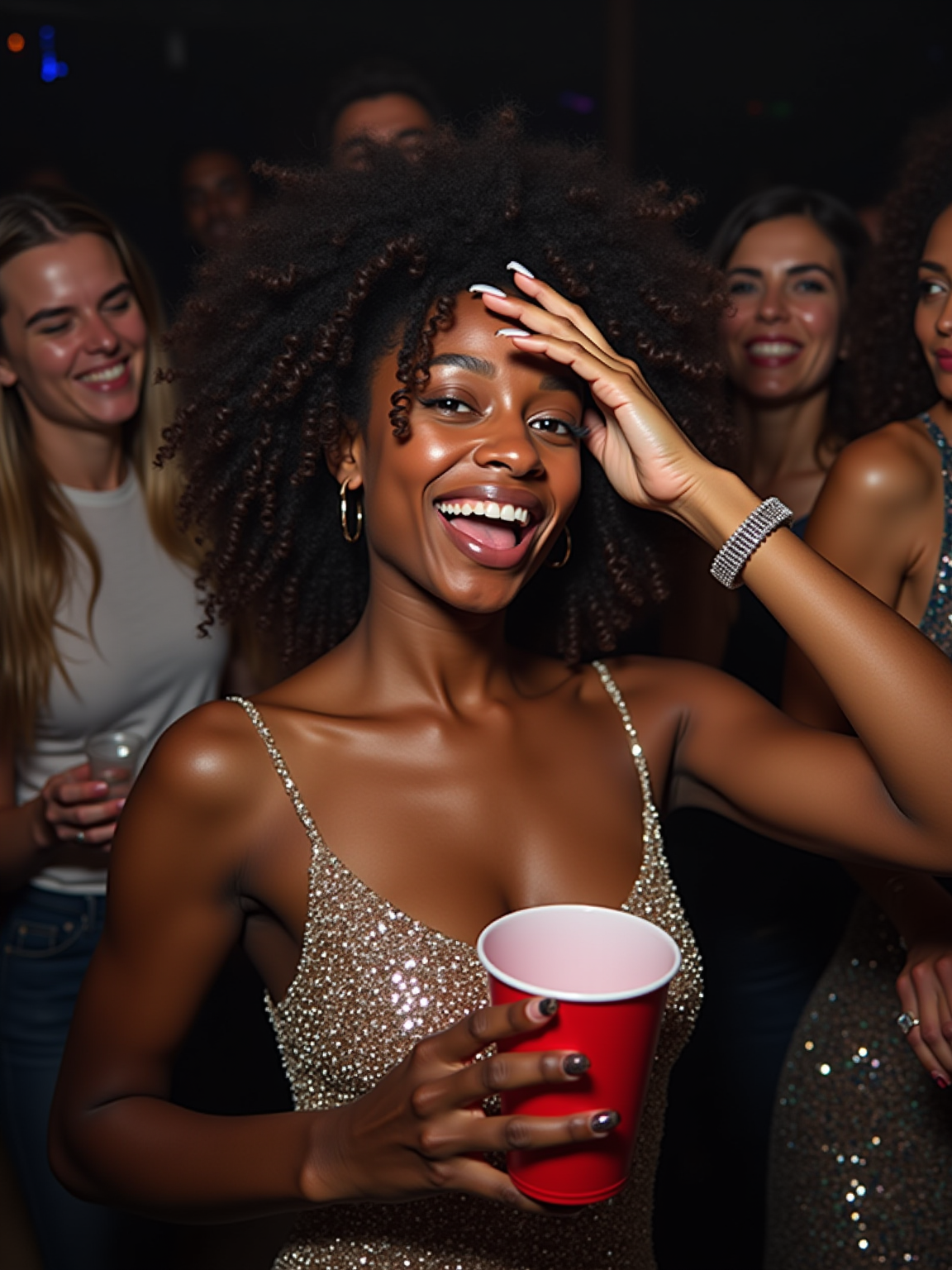camera flash overexposed, model at a crowded house party, red solo cup in hand. Wearing a sexy sparkly party dress, flirty pose, playful and sultry expression, showing some skin . Flash-lit faces, messy background, candid vibe.