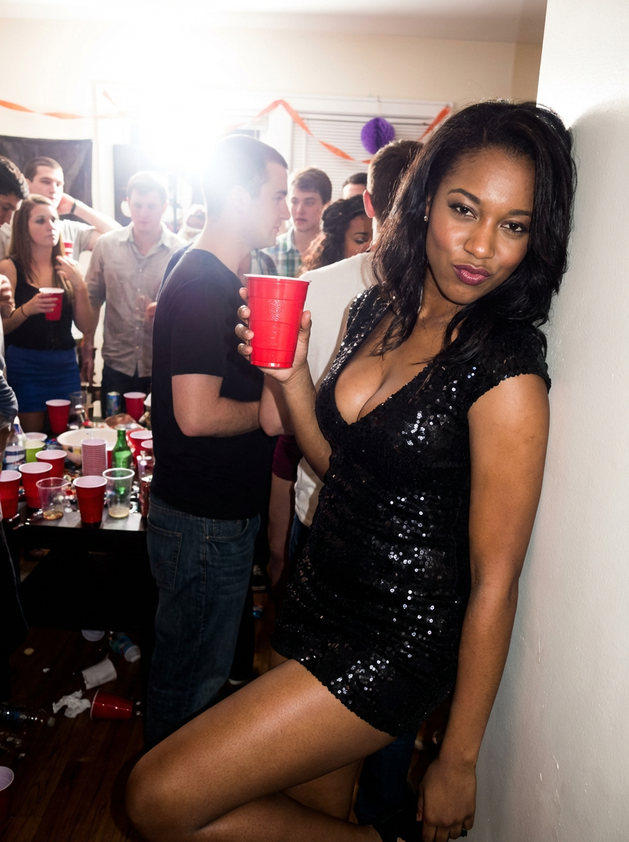 camera flash overexposed, model at a crowded house party, red solo cup in hand. Wearing a sexy sparkly party dress, flirty pose, playful and sultry expression, showing some skin . Flash-lit faces, messy background, candid vibe.