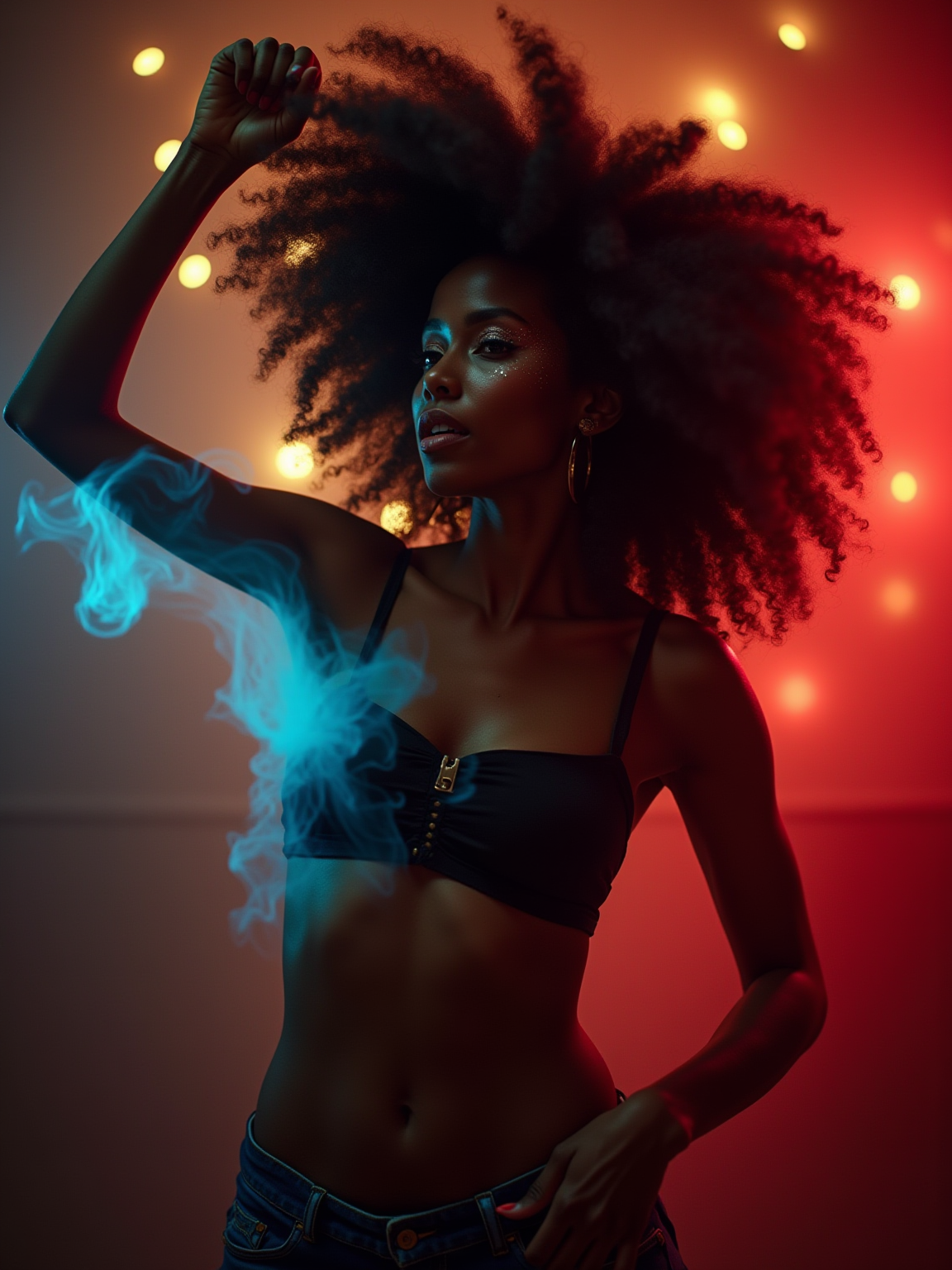 camera flash overexposed, model dancing in a dimly lit living room. Wearing glitter eyeshadow, hair flying, sexy dance move, body in motion, confident and alluring . Flash freeze, motion blur, party chaos.