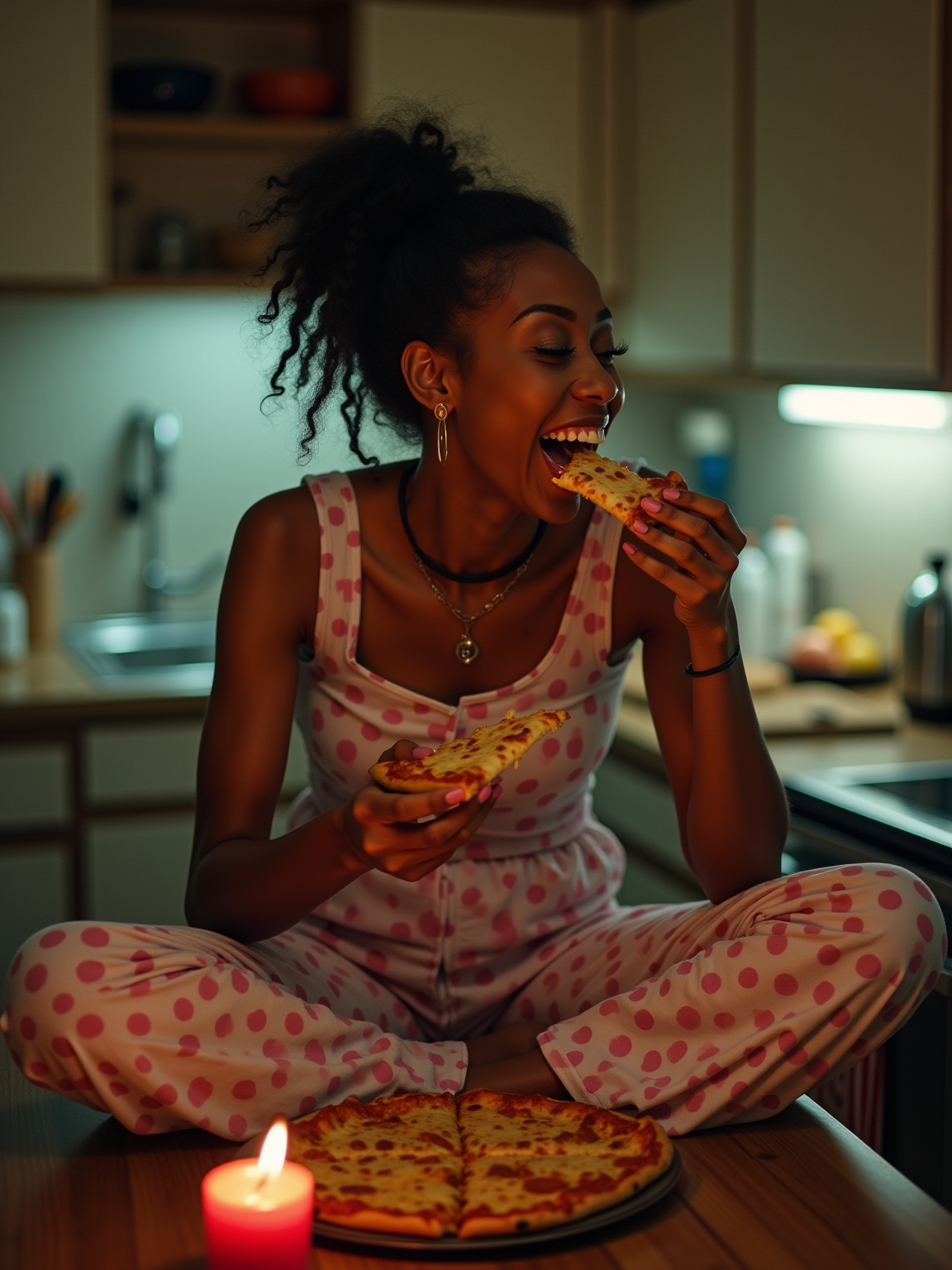 camera flash overexposed, model eating pizza on a kitchen counter at 2am. Wearing cute pajamas, messy bun, laughing, sitting on counter with legs up, playful and sexy . Flash-lit, cluttered kitchen, late night snack.
