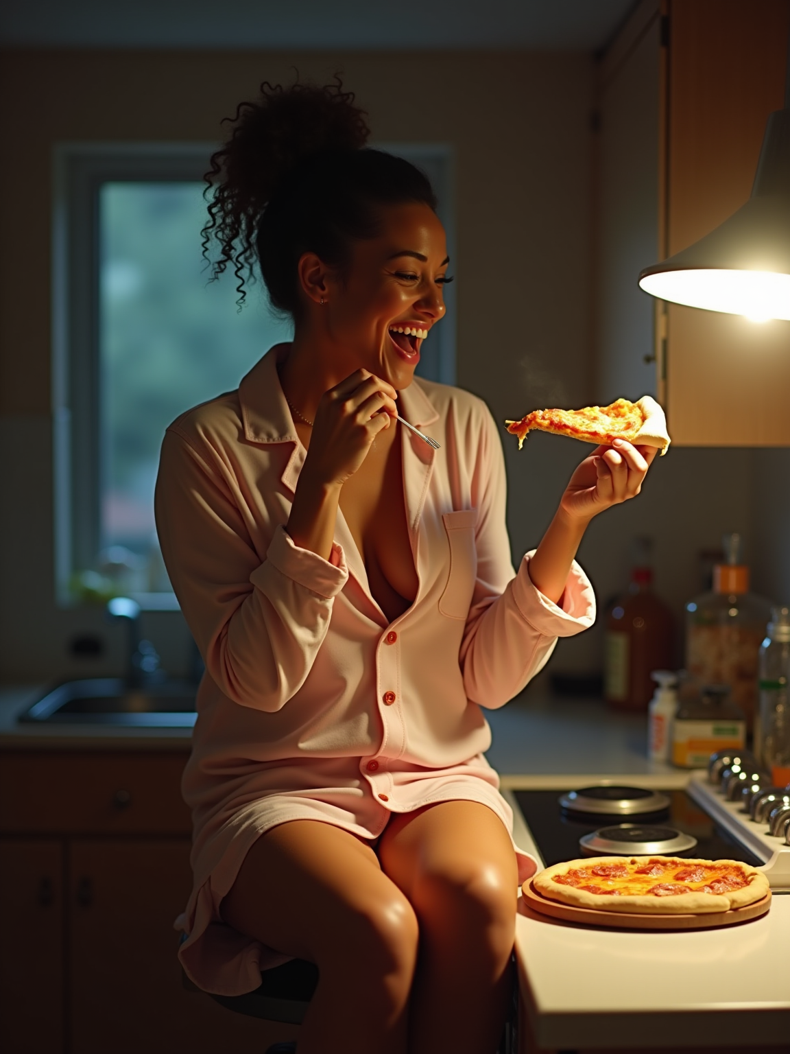 camera flash overexposed, model eating pizza on a kitchen counter at 2am. Wearing cute pajamas, messy bun, laughing, sitting on counter with legs up, playful and sexy . Flash-lit, cluttered kitchen, late night snack.