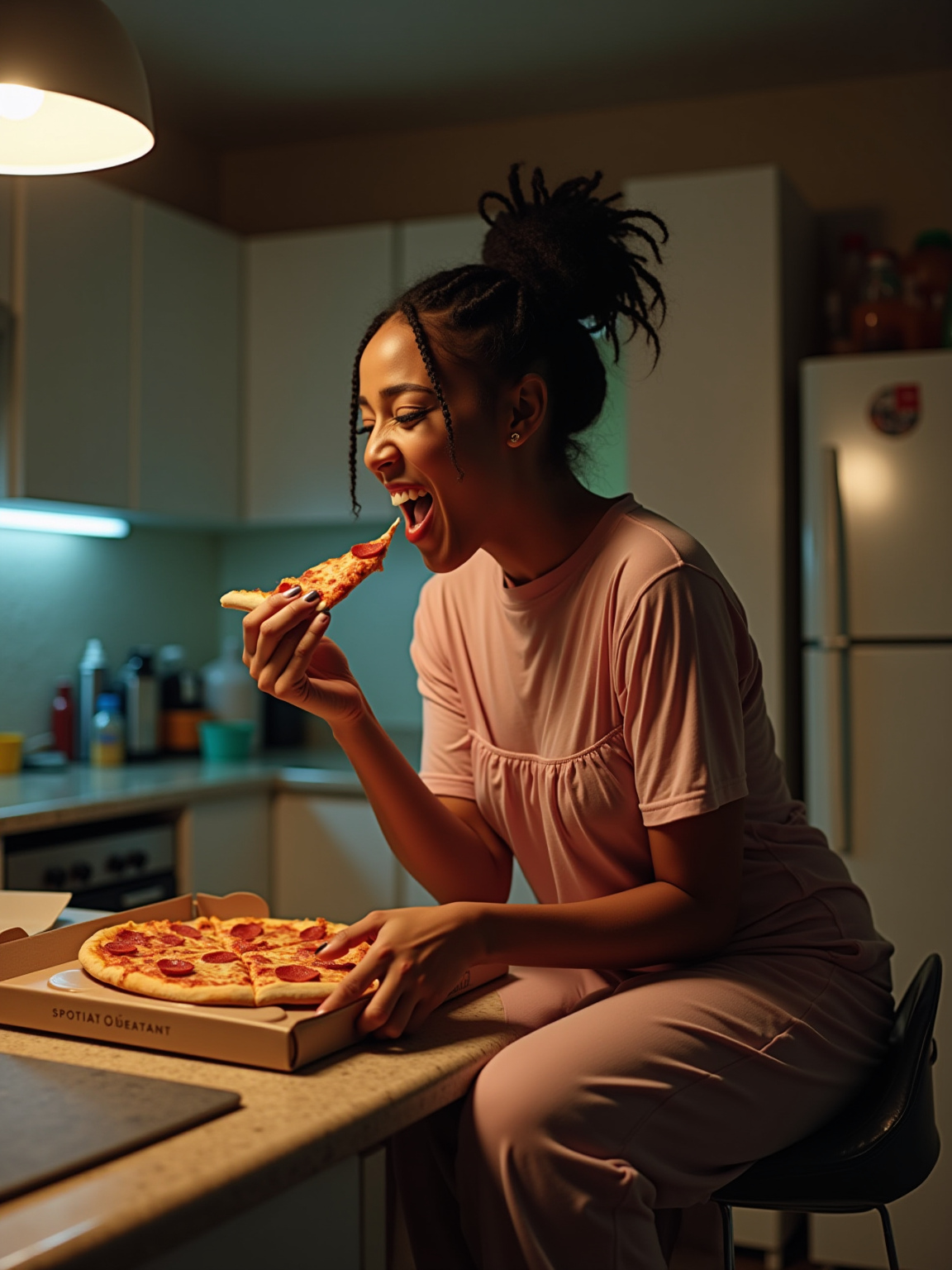 camera flash overexposed, model eating pizza on a kitchen counter at 2am. Wearing cute pajamas, messy bun, laughing, sitting on counter with legs up, playful and sexy . Flash-lit, cluttered kitchen, late night snack.