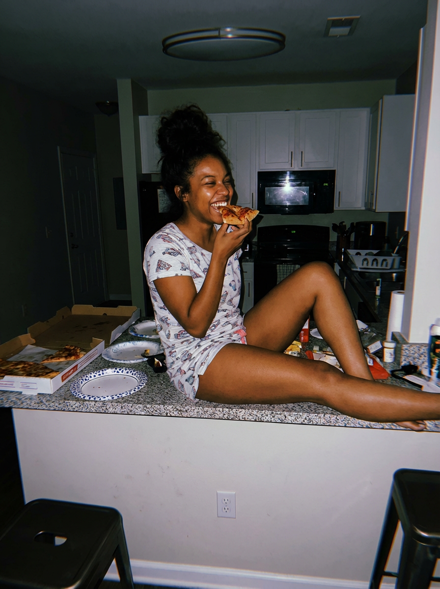 camera flash overexposed, model eating pizza on a kitchen counter at 2am. Wearing cute pajamas, messy bun, laughing, sitting on counter with legs up, playful and sexy . Flash-lit, cluttered kitchen, late night snack.