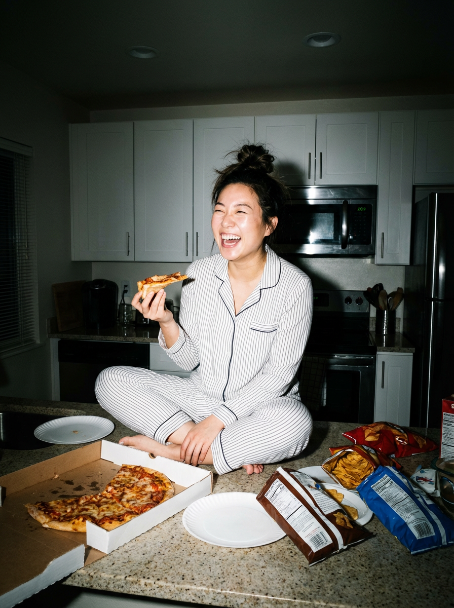 camera flash overexposed, model eating pizza on a kitchen counter at 2am. Wearing cute pajamas, messy bun, laughing, sitting on counter with legs up, playful and sexy . Flash-lit, cluttered kitchen, late night snack.