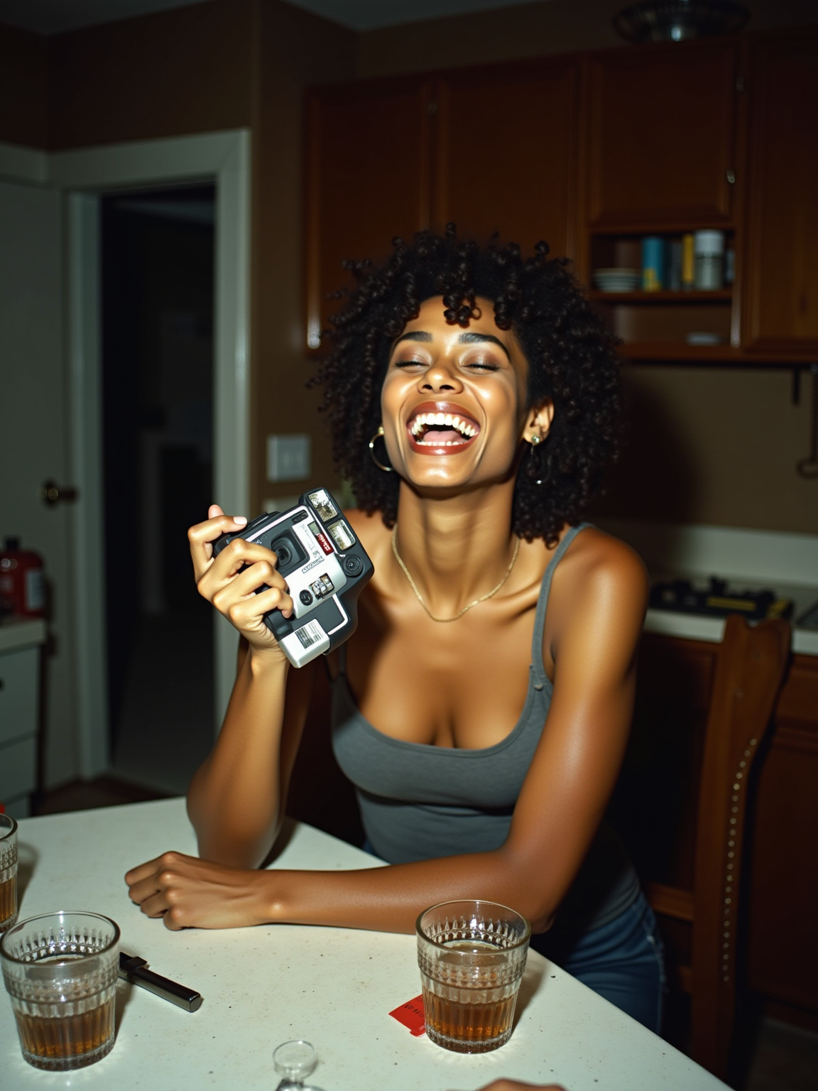 camera flash overexposed, model holding a disposable camera, mid-laugh at a kitchen table. Wearing a tight tank top, messy hair, leaning forward, sexy and candid . Flash-lit, candid, party aftermath.