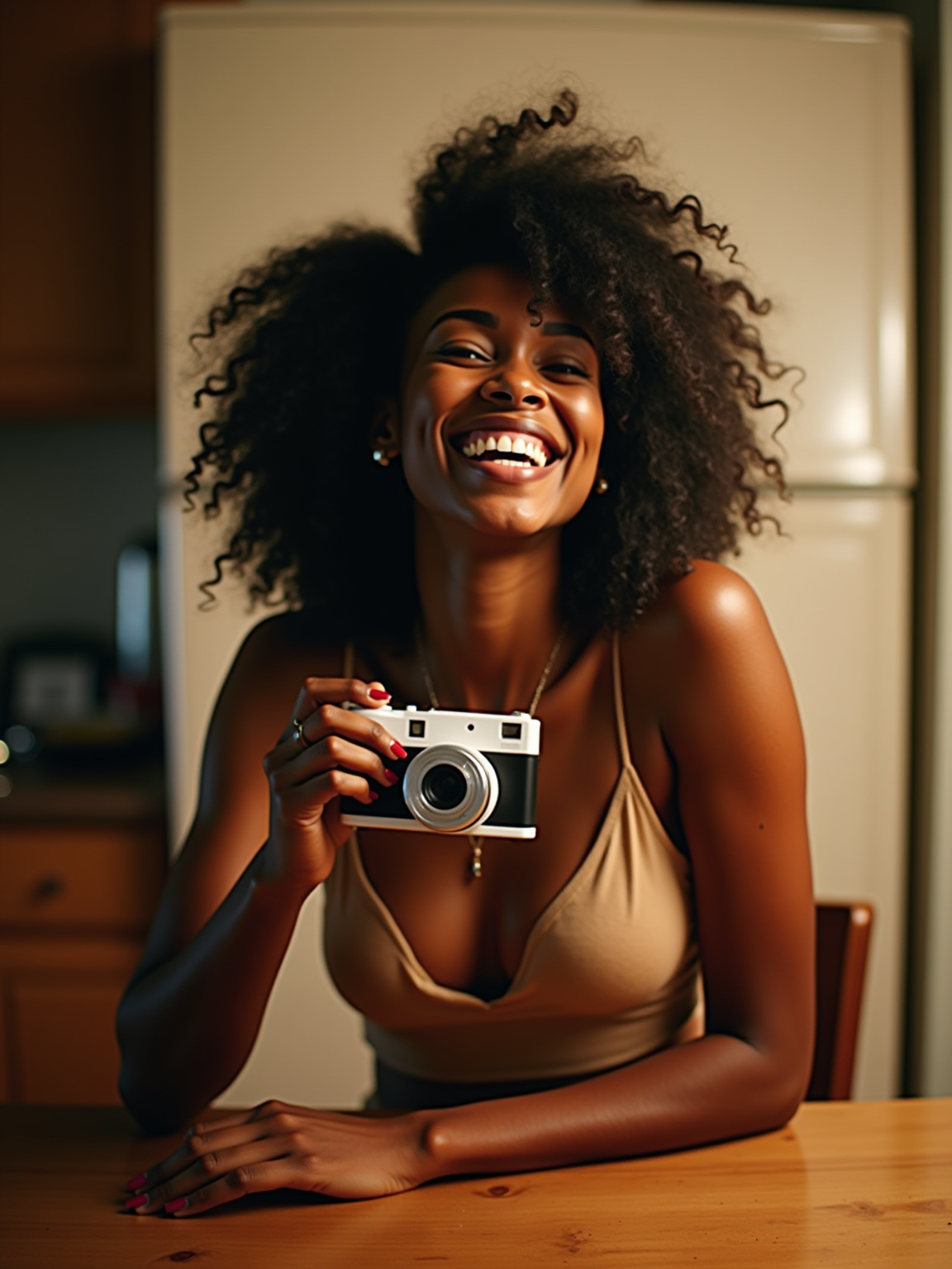 camera flash overexposed, model holding a disposable camera, mid-laugh at a kitchen table. Wearing a tight tank top, messy hair, leaning forward, sexy and candid . Flash-lit, candid, party aftermath.