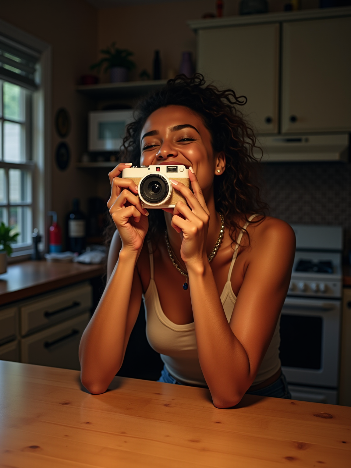 camera flash overexposed, model holding a disposable camera, mid-laugh at a kitchen table. Wearing a tight tank top, messy hair, leaning forward, sexy and candid . Flash-lit, candid, party aftermath.