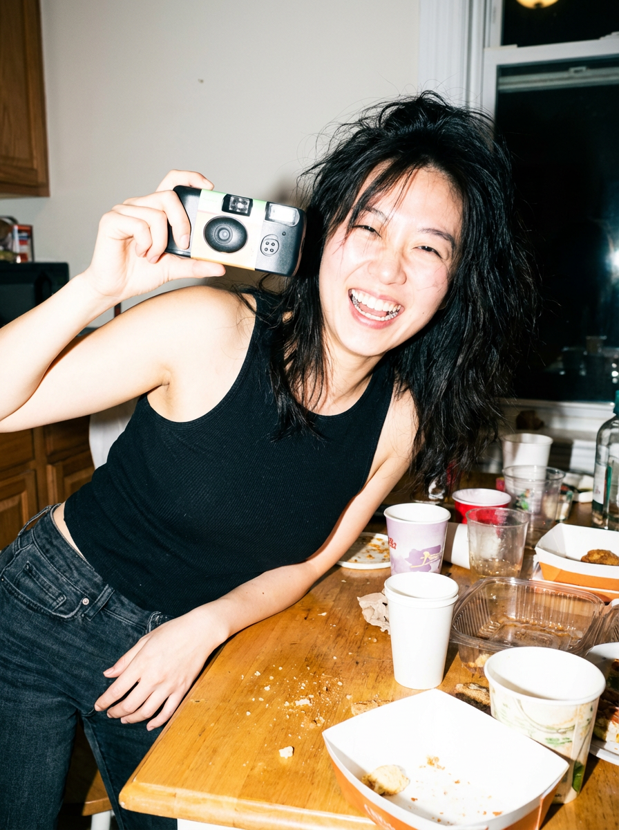 camera flash overexposed, model holding a disposable camera, mid-laugh at a kitchen table. Wearing a tight tank top, messy hair, leaning forward, sexy and candid . Flash-lit, candid, party aftermath.