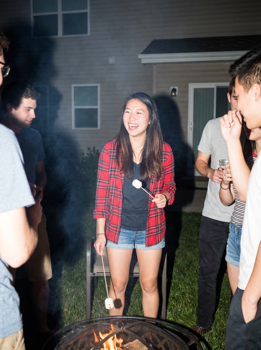 camera flash overexposed, model in a backyard, friends gathered around a fire pit. Wearing flannel shirt over denim shorts, roasting marshmallow, sexy and playful . Flash, night, house party outdoors.