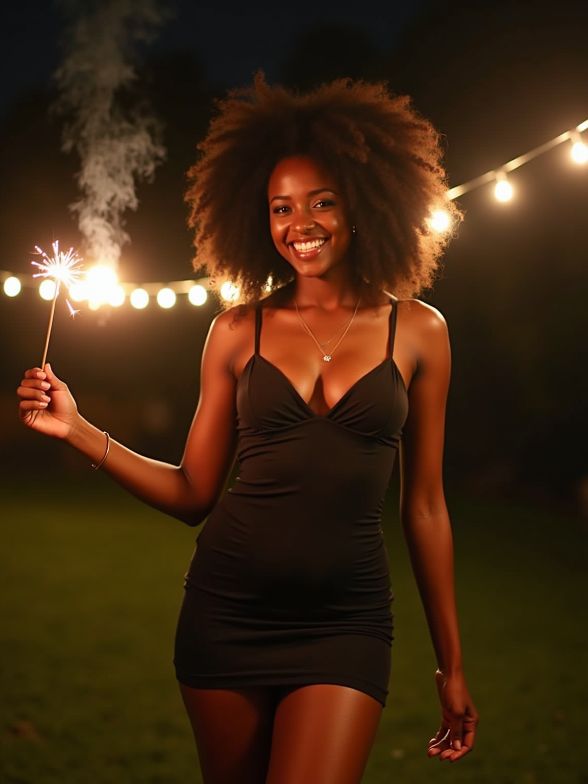 camera flash overexposed, model in a backyard with string lights, holding a sparkler. Wearing a short bodycon dress, smiling, playful and sexy, showing legs . Flash and string lights, summer night.