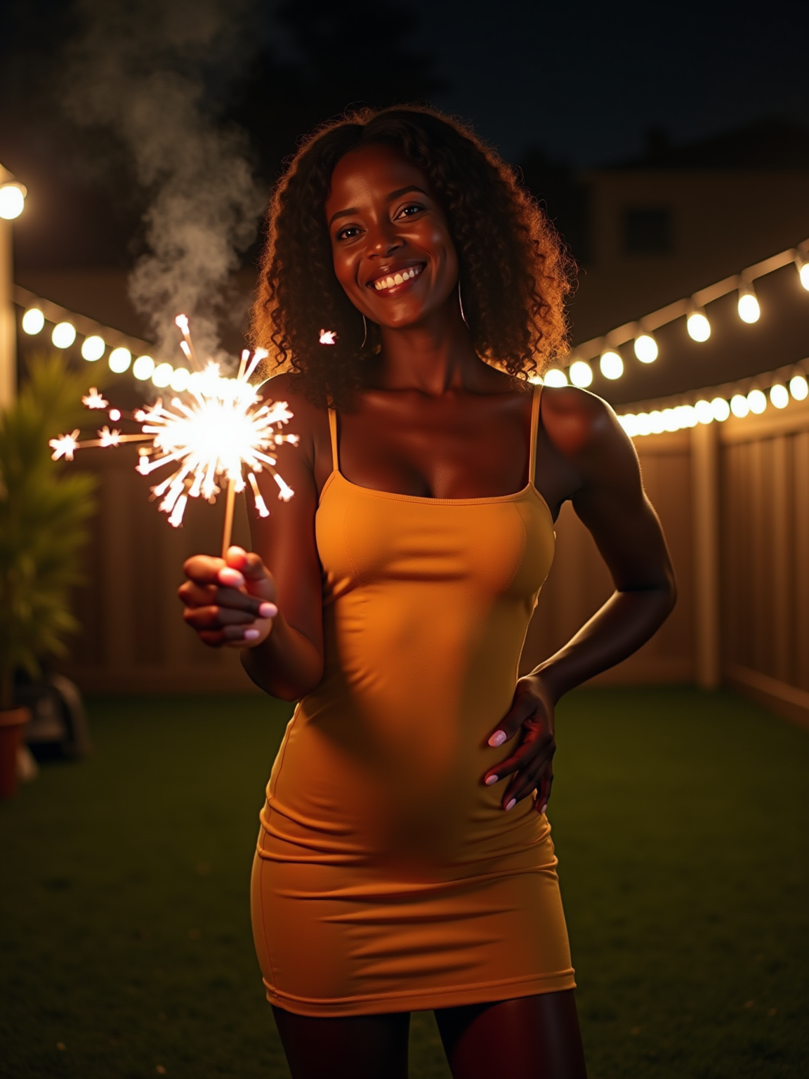 camera flash overexposed, model in a backyard with string lights, holding a sparkler. Wearing a short bodycon dress, smiling, playful and sexy, showing legs . Flash and string lights, summer night.