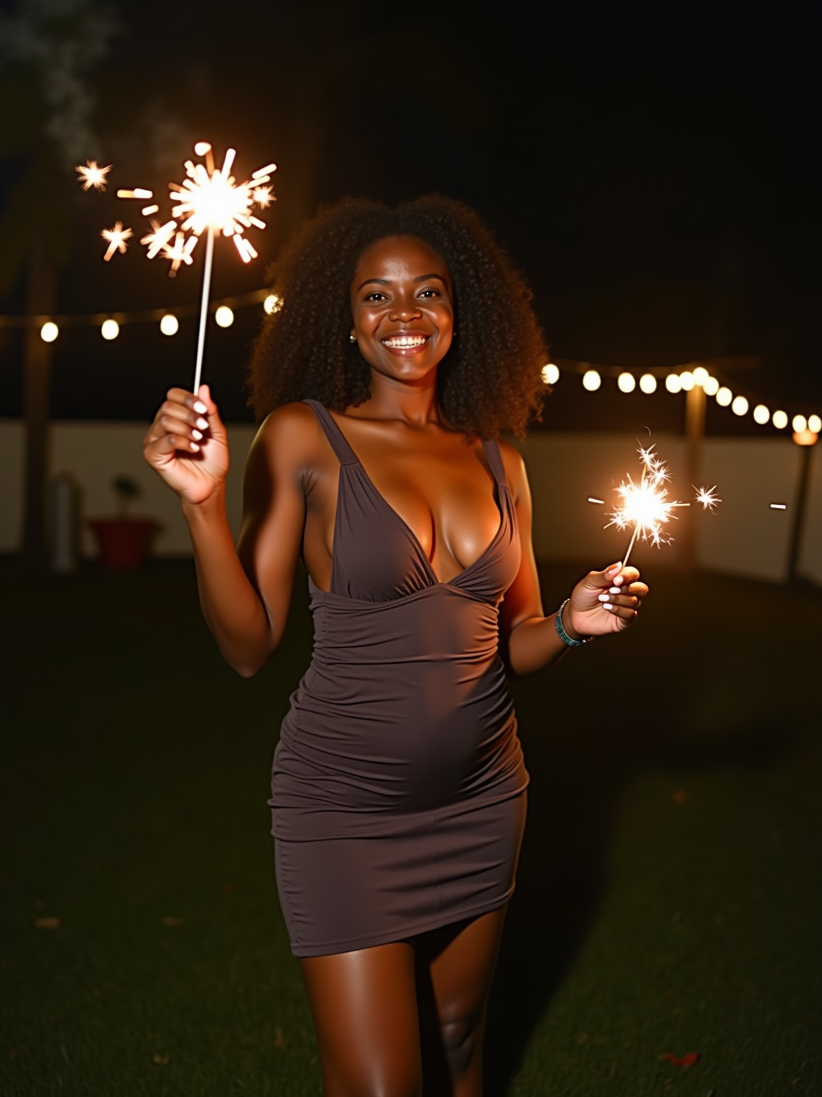 camera flash overexposed, model in a backyard with string lights, holding a sparkler. Wearing a short bodycon dress, smiling, playful and sexy, showing legs . Flash and string lights, summer night.