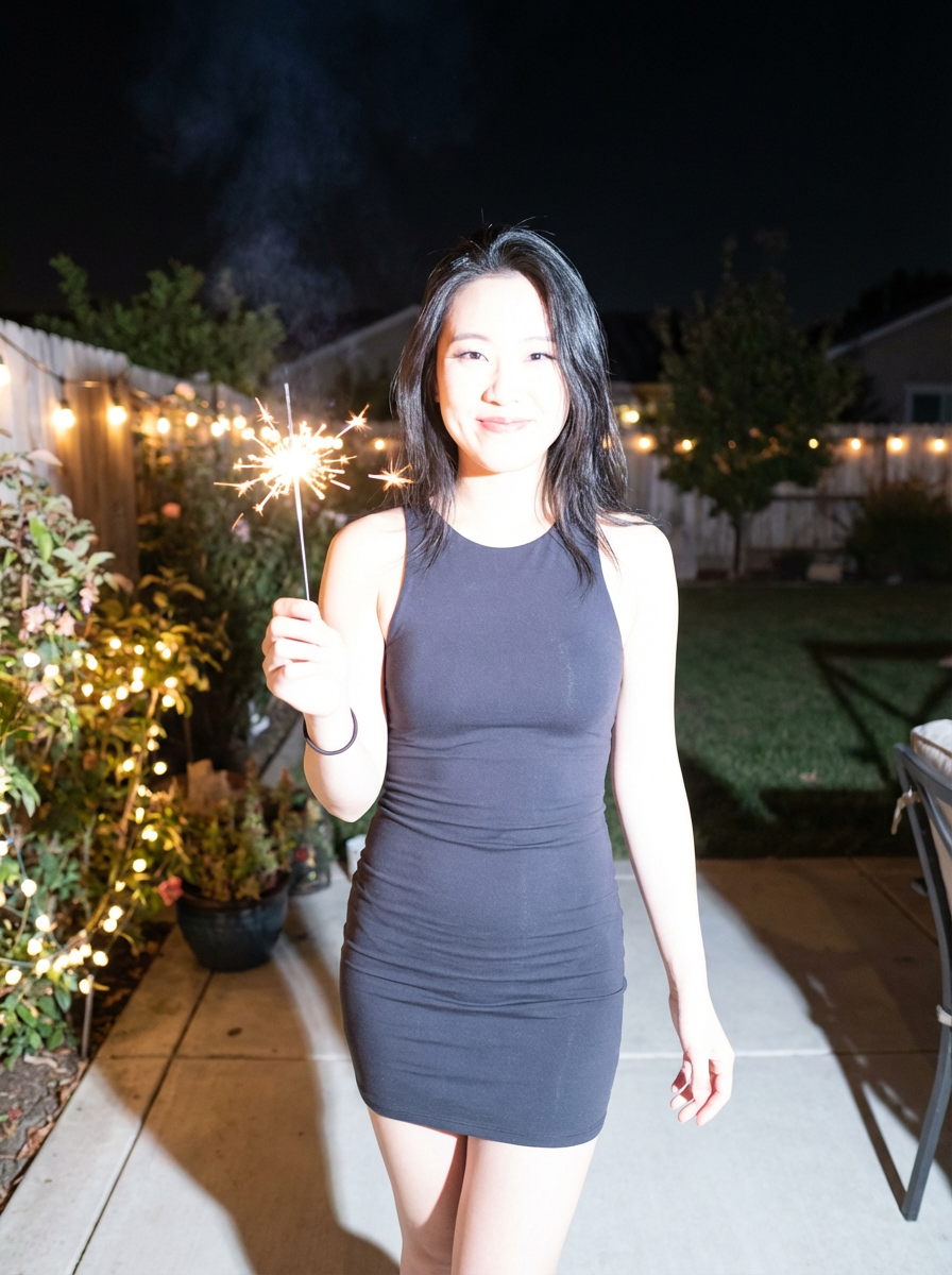 camera flash overexposed, model in a backyard with string lights, holding a sparkler. Wearing a short bodycon dress, smiling, playful and sexy, showing legs . Flash and string lights, summer night.