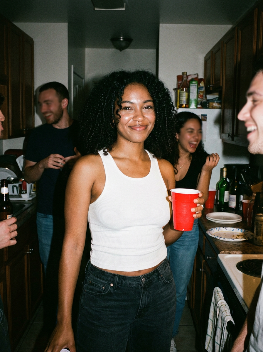 camera flash overexposed, model in a crowded kitchen, people talking and laughing around. Wearing a tight tank top, holding a drink, flirty smile, sexy body language . Flash, candid, social chaos.