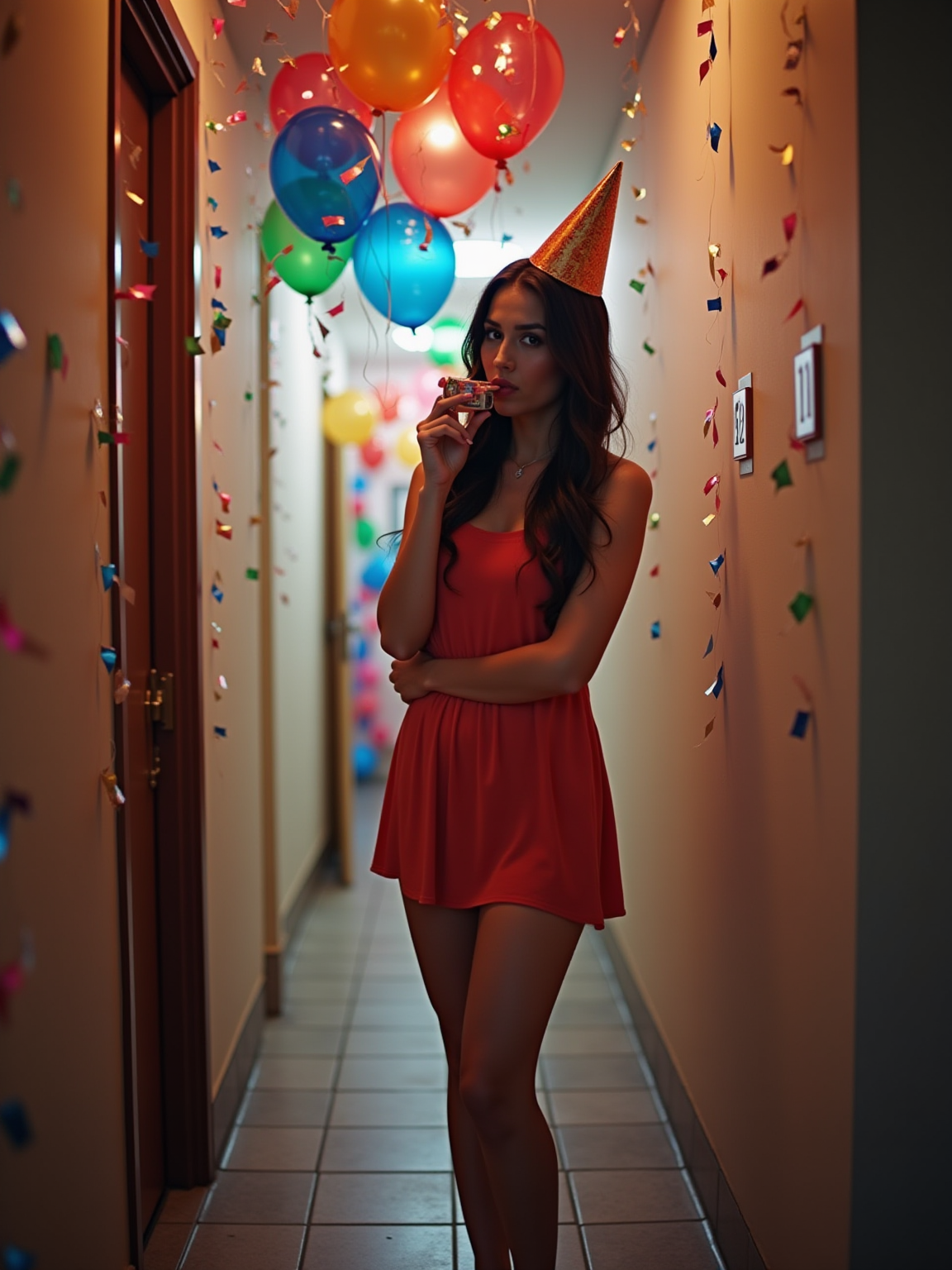 camera flash overexposed, model in a hallway with party streamers and balloons. Wearing party hat, blowing a noisemaker, short dress, playful and sexy pose . Flash, decorations, celebration energy.