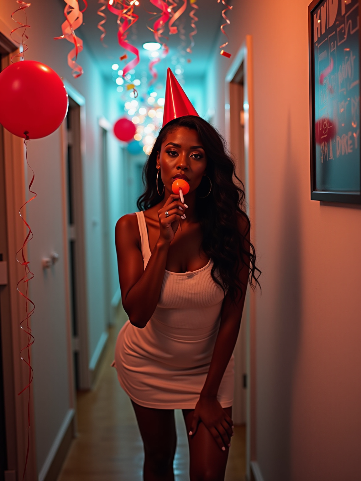 camera flash overexposed, model in a hallway with party streamers and balloons. Wearing party hat, blowing a noisemaker, short dress, playful and sexy pose . Flash, decorations, celebration energy.