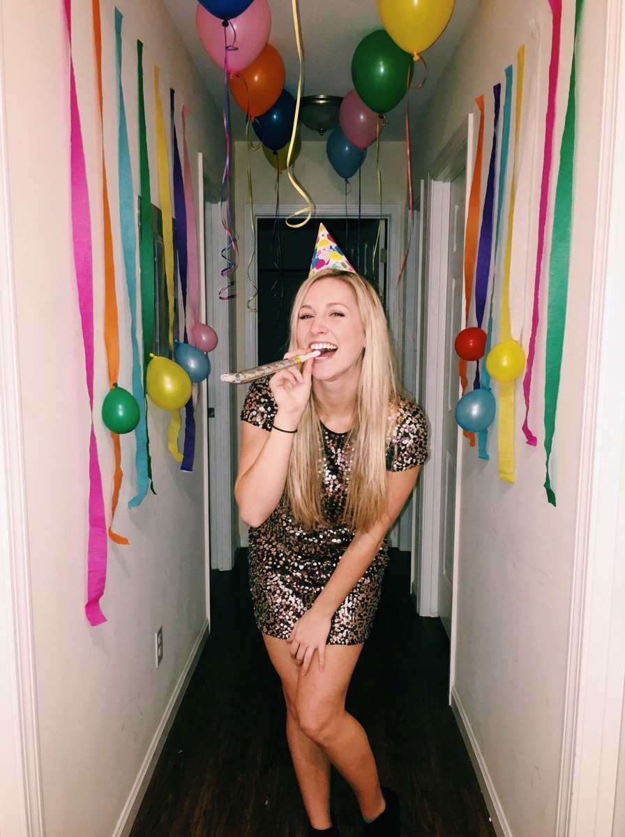 camera flash overexposed, model in a hallway with party streamers and balloons. Wearing party hat, blowing a noisemaker, short dress, playful and sexy pose . Flash, decorations, celebration energy.