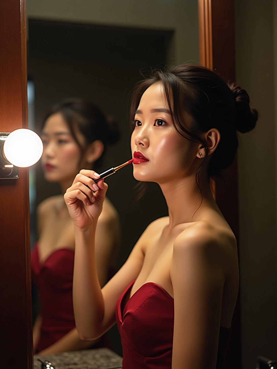 camera flash overexposed, model in front of a bathroom mirror, lipstick smudged. Wearing a sexy party dress, fixing makeup, sultry look, dress slightly off-shoulder . Flash, mirror reflection, end of night.