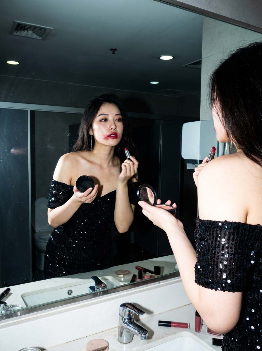 camera flash overexposed, model in front of a bathroom mirror, lipstick smudged. Wearing a sexy party dress, fixing makeup, sultry look, dress slightly off-shoulder . Flash, mirror reflection, end of night.