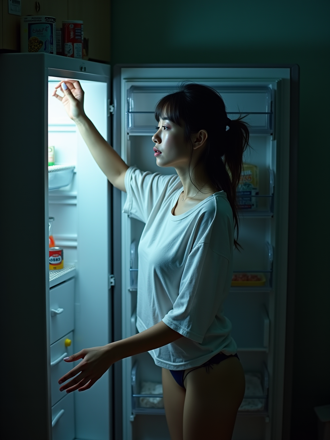 camera flash overexposed, model opening the fridge at 3am, kitchen a mess. Wearing oversized t-shirt, no pants, sleepy eyes, sexy and real . Flash-lit, real life, afterparty.