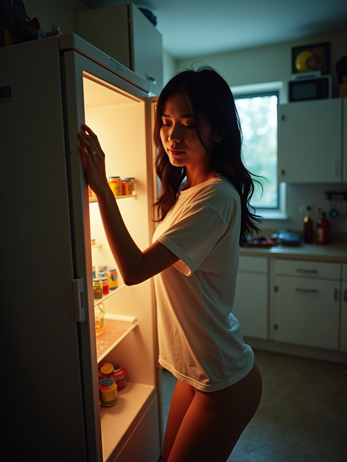 camera flash overexposed, model opening the fridge at 3am, kitchen a mess. Wearing oversized t-shirt, no pants, sleepy eyes, sexy and real . Flash-lit, real life, afterparty.
