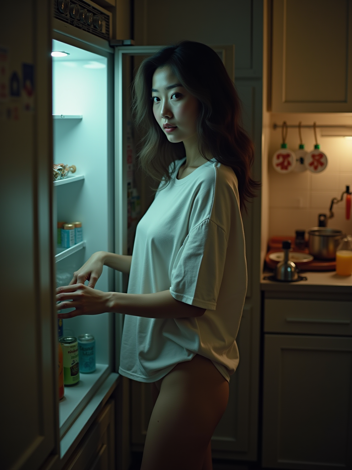 camera flash overexposed, model opening the fridge at 3am, kitchen a mess. Wearing oversized t-shirt, no pants, sleepy eyes, sexy and real . Flash-lit, real life, afterparty.